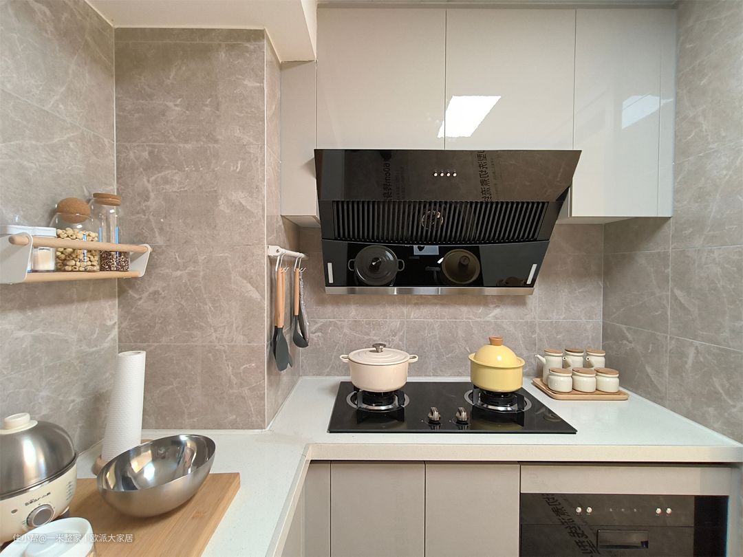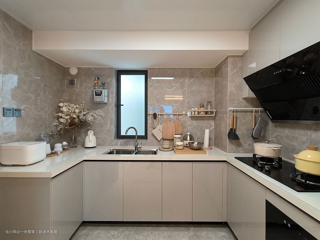 经过餐厅,就可以看到半开放式厨房,U型的台面设计,洗、切、炒三角动线非常的流畅自然。墙面全部贴砖,灰色花纹耐脏,日常方便清洗。悬挂式收纳日常厨具、调料等,整体设计注重空间利用和便捷性,创造一个高效、时尚的现代厨房环境。 白色亮面到顶的吊柜搭配嵌入式油烟机,整体美观不浪费空间,也比较好清理。橱柜没有做把手,现代简约的拉门,和吊柜形成一体。双灶台可以在烹煮的过程中很好的节省时间和空间。