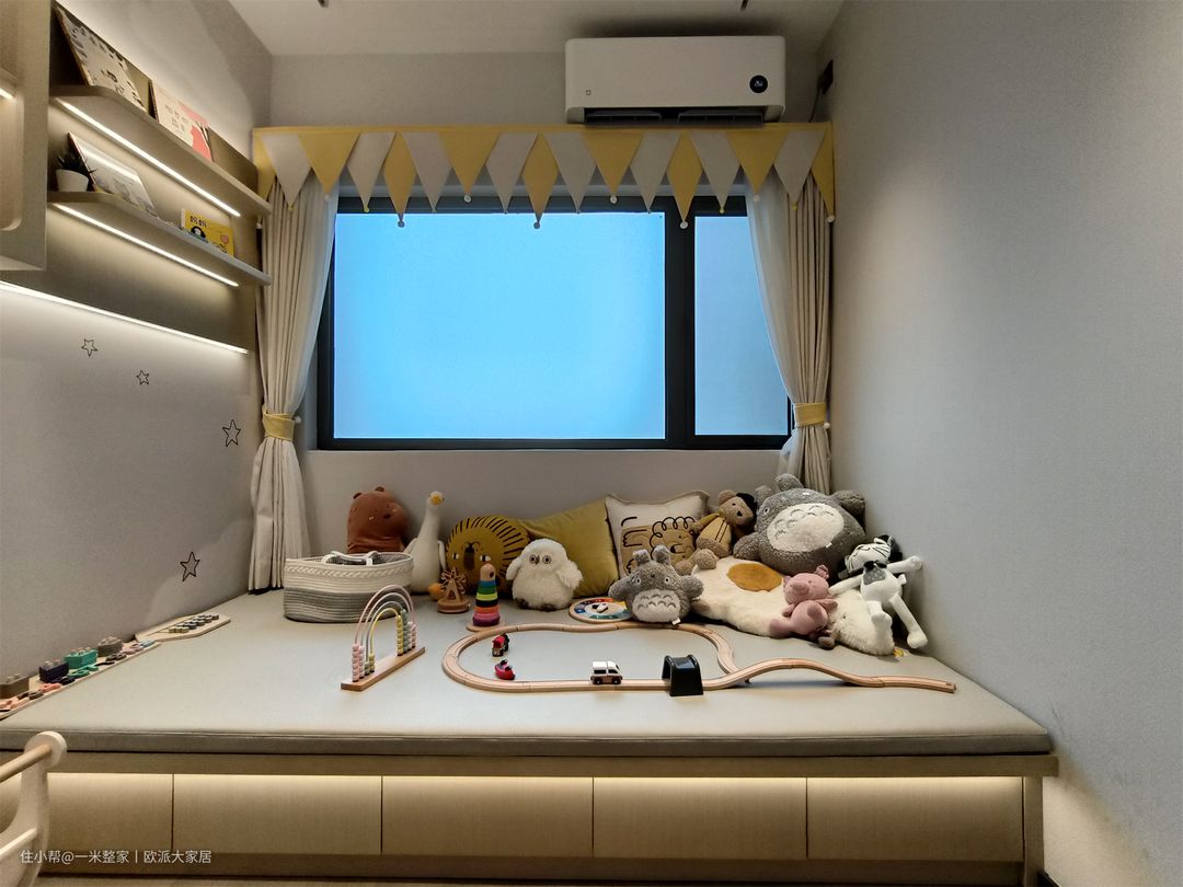 儿童房和其他卧室一样,依旧是无主灯设计,设置了环绕灯带和小射灯,空间愈加有童真氛围。 进门就可以感受到孩童天真烂漫的气息,选择浅灰色的墙面颜色,可以为儿童房带来一种简洁而不失温暖的感觉。各式各样的玩偶摆放在榻榻米床上,墙上悬挂式收纳柜存放着孩子喜爱的毛绒玩具和童话故事书,温馨治愈的居住环境呈现在眼前。