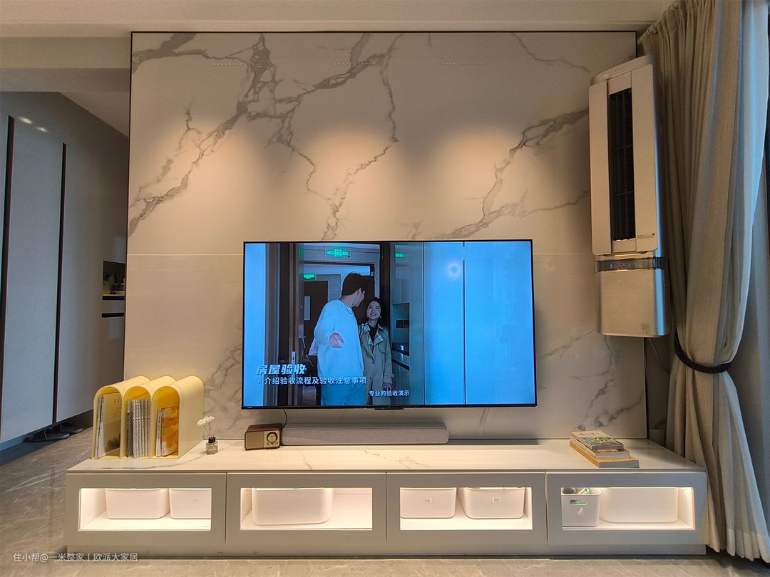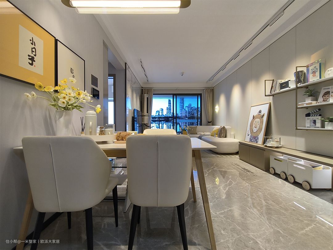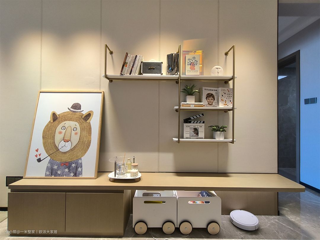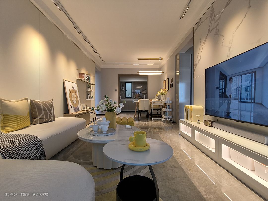 客厅大平顶设计,上面做了L型灯带,四周做了射筒灯,摈弃主灯设计,很有氛围感。灰白色的背景墙,营造出宁静平和的气氛。搭配简约的家具,如白色布艺L型沙发、大理石茶几、边几和单人黄色沙发等,以保持整体风格的统一性。灰白色调既能提供稳定和平静的感觉,又能为空间增添一份优雅和现代感。 沙发旁边是简单的L型悬挂式收纳架、悬空置物台和动物狮子装饰画,这样的设计可以节省空间、并且很美观实用。装饰画给客厅增添了一分童趣。 舍弃满墙电视柜的设计,做了一字型开放式电视收纳柜,柜子贴合地面,底部不易落灰好清理。电视墙用了大理石花纹背景,加入了悬挂式空调,整洁又节省空间。