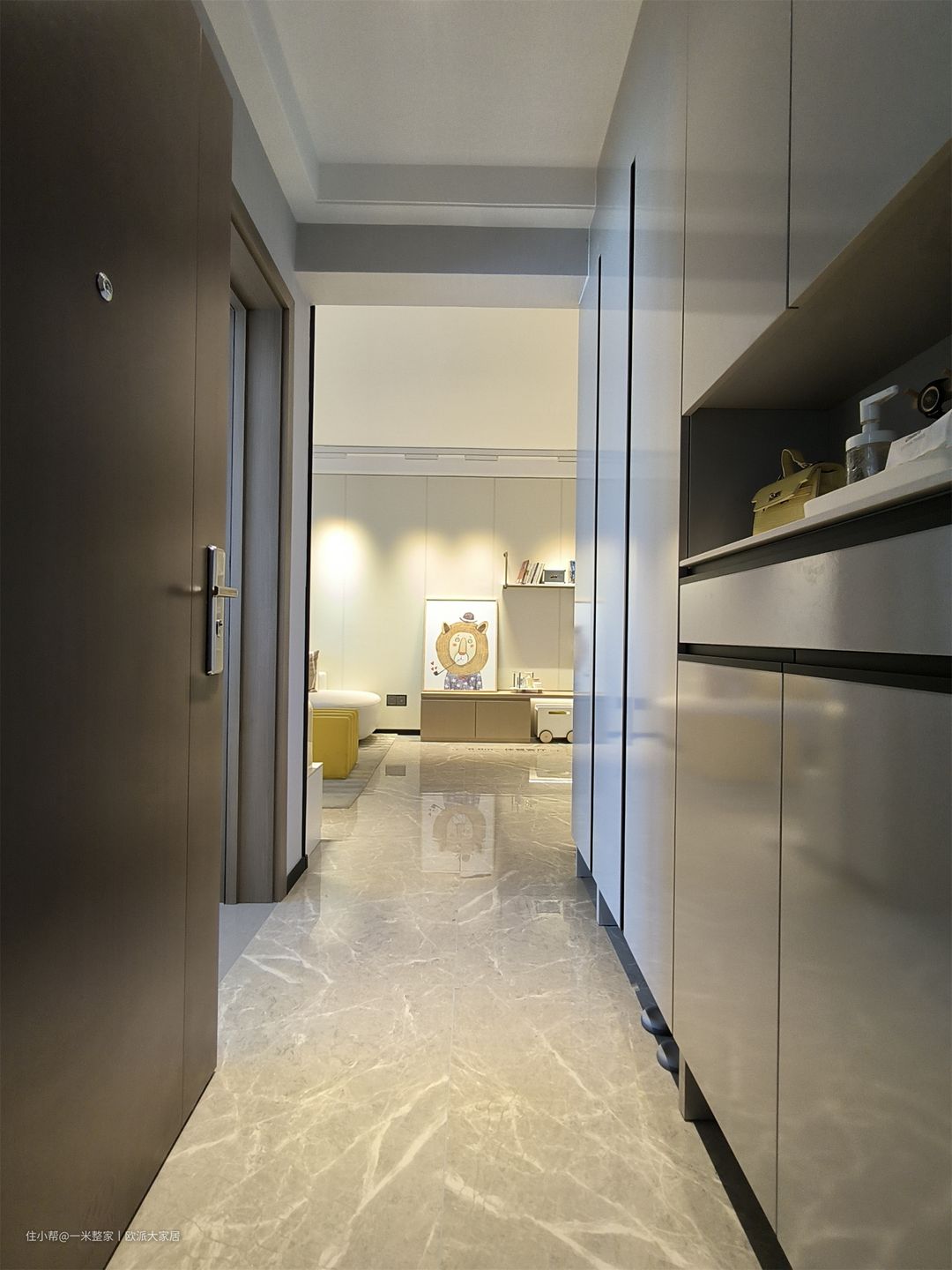 进门就是到顶的嵌入式玄关柜设计,看起来非常的整洁美观。中部开放格的设计放置包包和洗手液等日常所需物品,使用起来真的是很方便呢。柜子整体采用灰白调,开关处使用黑色,黑白灰搭配,协调一致,中和了白色过于简单的特性,整洁不凌乱。