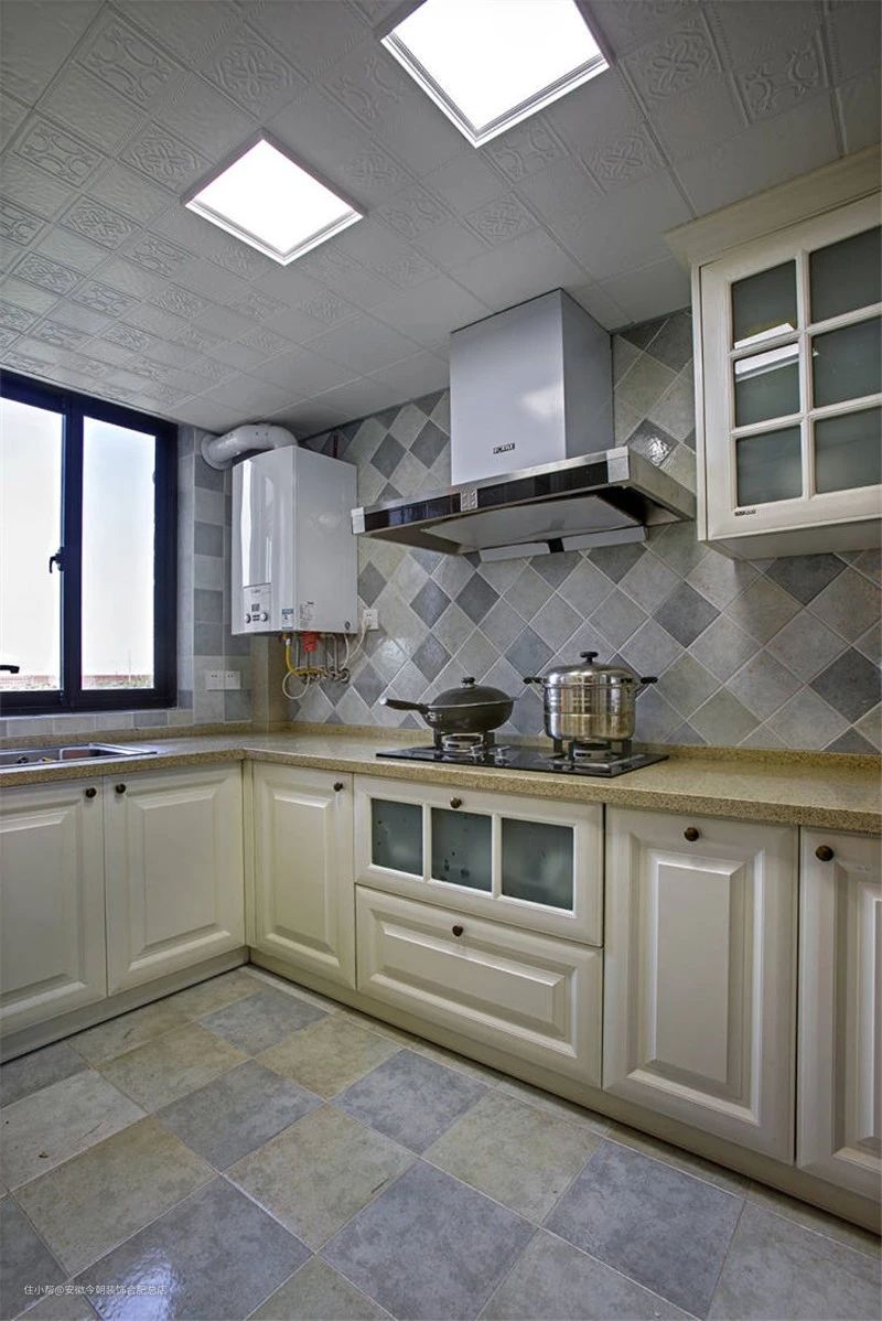 白色橱柜与相间的格子墙地面相搭,让厨房显得格外别致,具有整体性。