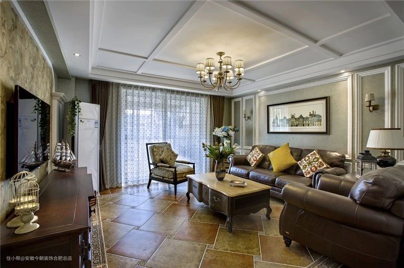 皮质家具或皮革贴面家具常见于美式风格客厅,可以增加质感和经典感。 石膏线可以用于天花板或墙壁的装饰,增加细节和复古的美感。