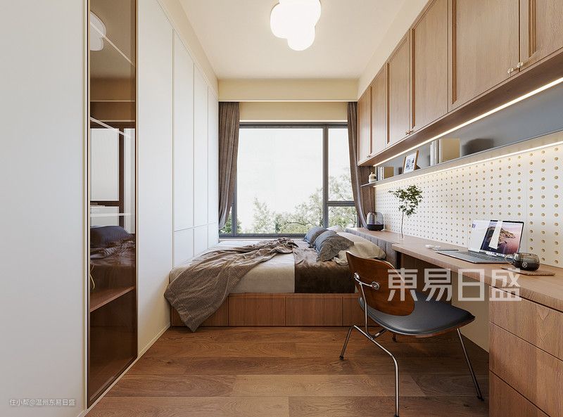 榻榻米房设计,空间虽小,但是功能齐全,充足的收纳空间,居住办公两不误,柔白的衣柜,木纹的榻榻米和书桌书柜,让空间分明。