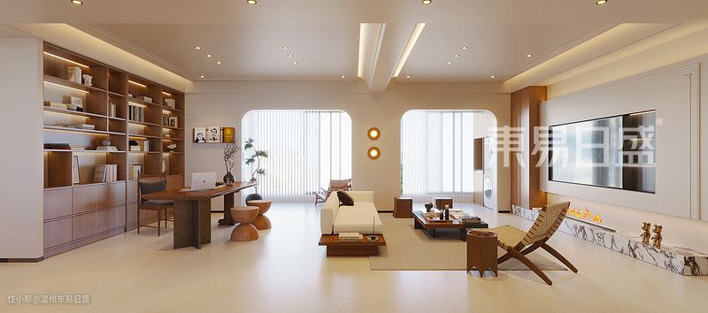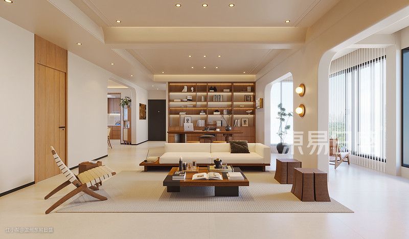 阳台封窗,客房打通,阳台作为休闲区纳入客厅,使客厅整体空间扩大,白色的主题色与木纹的软装,使客厅简洁又更具温馨。