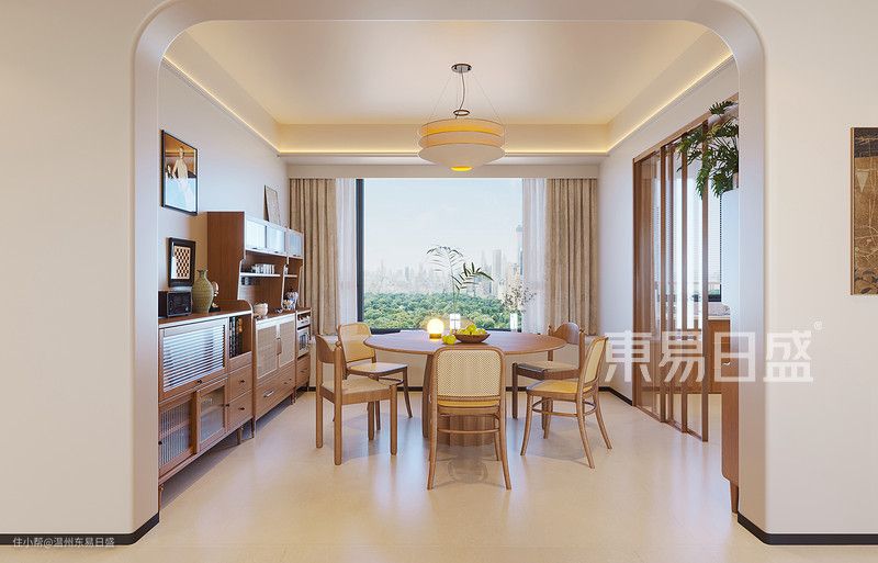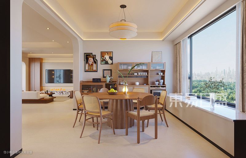 没有一味采用全屋定制的方式去做餐边柜,而是选择成品餐边柜的组合,让餐区空间看起来多了几分随性自然,保证收纳空间的同时,装饰物的搭配也有了更多的可能性