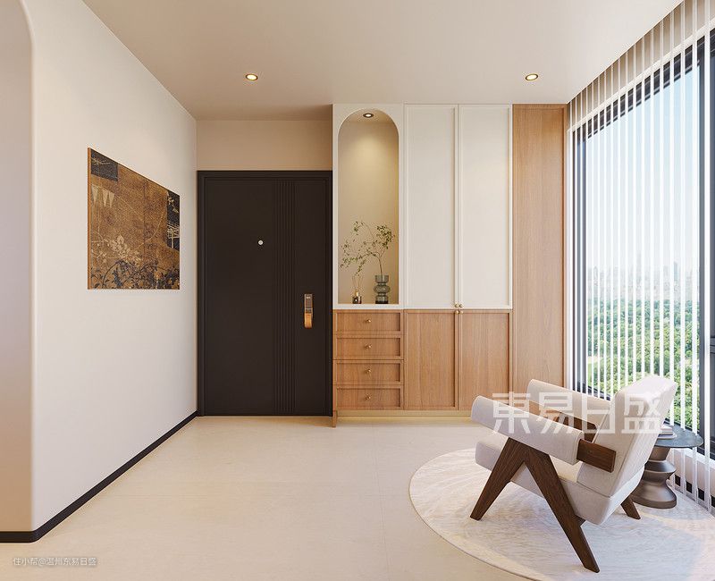 入门玄关吊平顶,做原木风的鞋柜,搭配带有木纹的小沙发与边几,使玄关的风格保持一致。