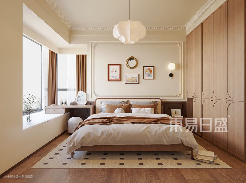 主卧室采用了优雅的木地板和原木风的软装搭配,与房间简洁柔白的风格形成鲜明对比。这种设计不仅赋予空间层次感,还营造出温馨舒适的氛围。柔和的灯光打造出宁静的氛围,让人在这个空间里感受到真正的放松和舒适