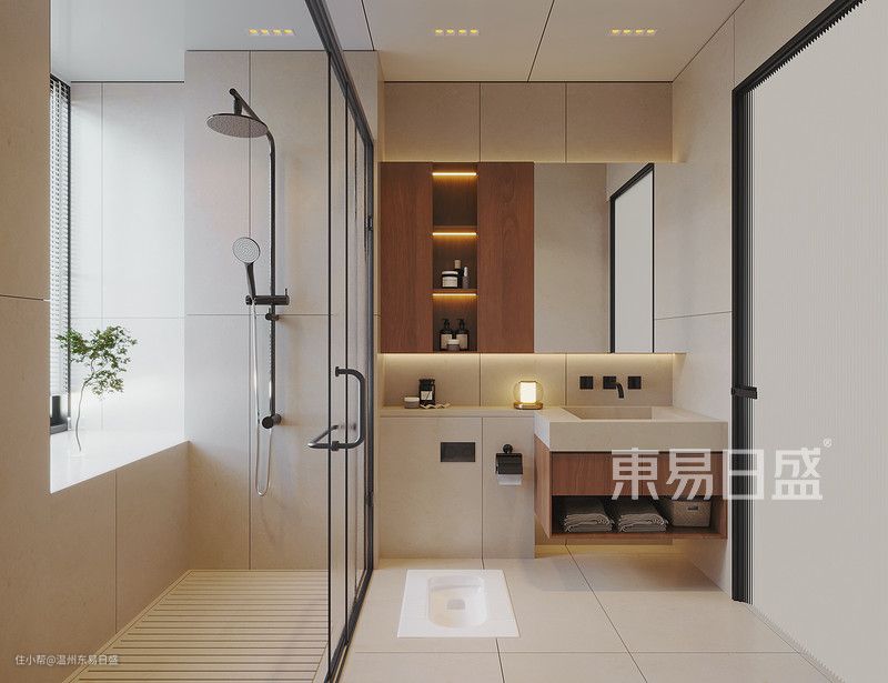 白色墙面搭配木纹橱柜,营造出清新舒适的氛围。浴镜面柜和LED灯带增加了空间感,让整体更加明亮通透。整体设计考虑了实用性和美观性,为主人提供了舒适便利的个人空间。