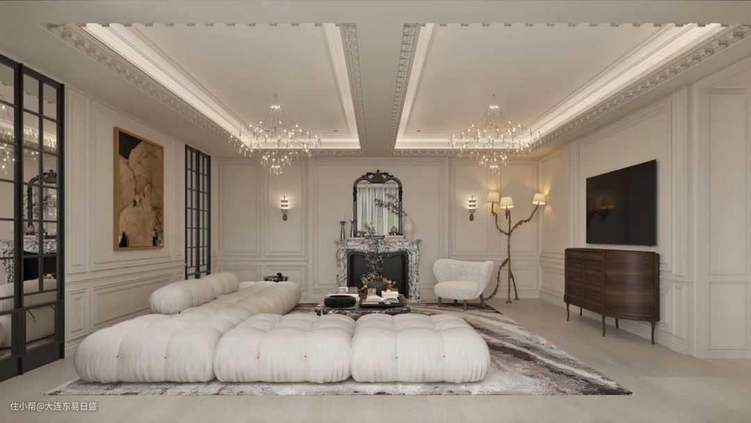 客厅采用了米白色来作为整体的主色调,大量的石膏线进行点缀,整体给人一种温馨的感觉,地毯与客厅整体相辅相成,精致的家具与灯具让整个空间都不失奢华之风