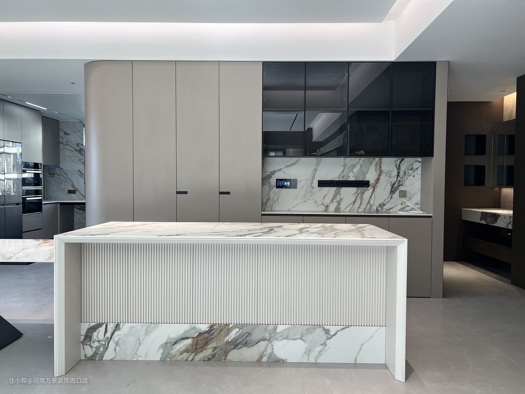 利用大理石隔断和玻璃屏风,划分成餐厅区域,既有隐私性,又有通透性。大理石岛台在具有美观的功能下,还能满足多人用餐需求。