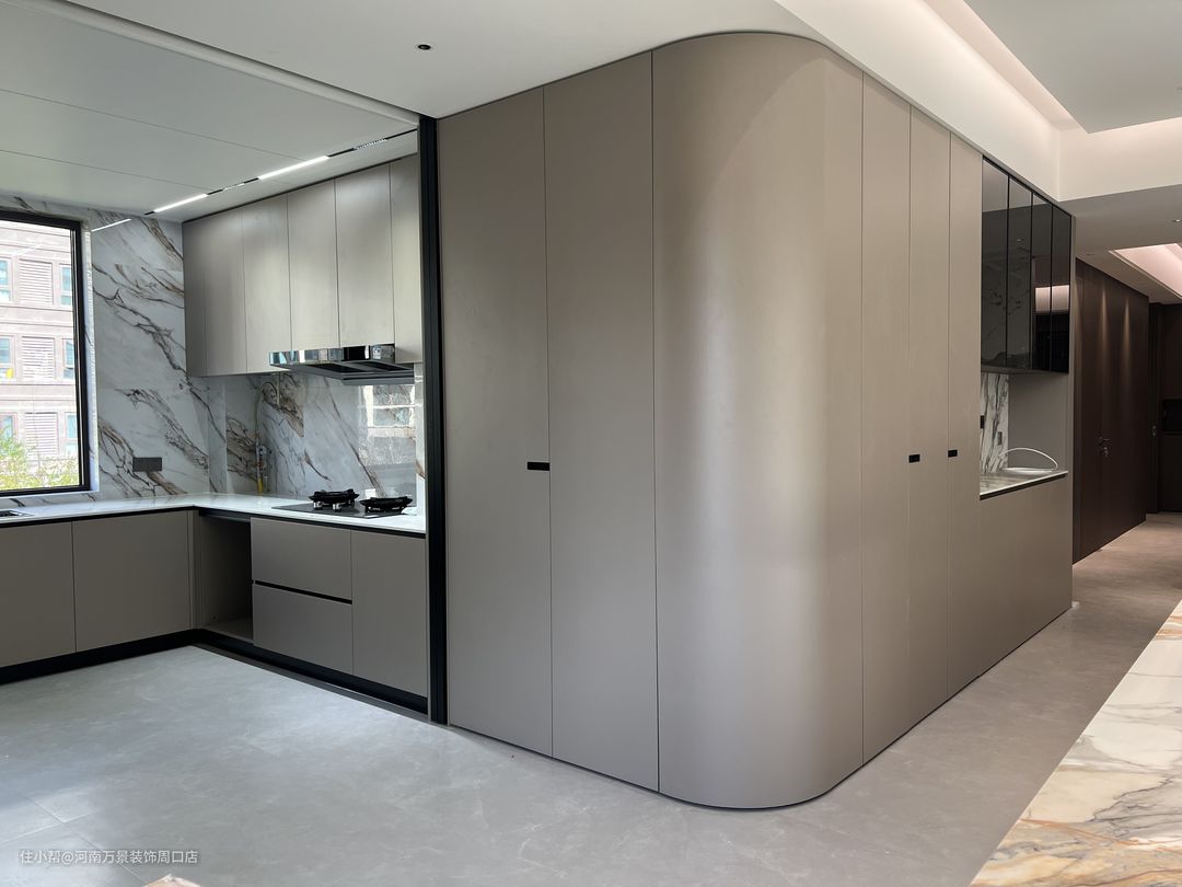 内嵌在柜子里的吊柜推来门,打开时是开放式厨房,关闭时是密闭式厨房,满足中西餐做饭需求!