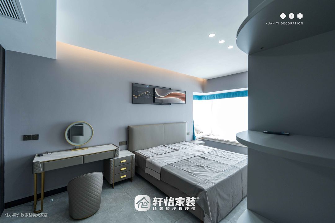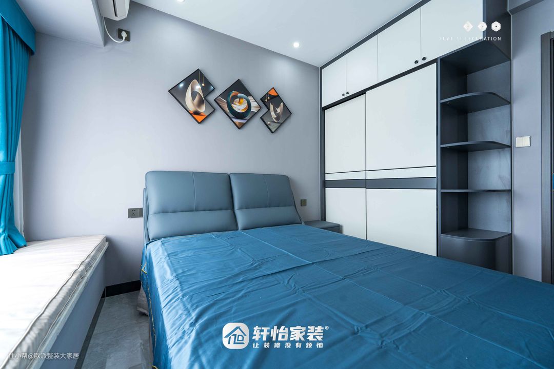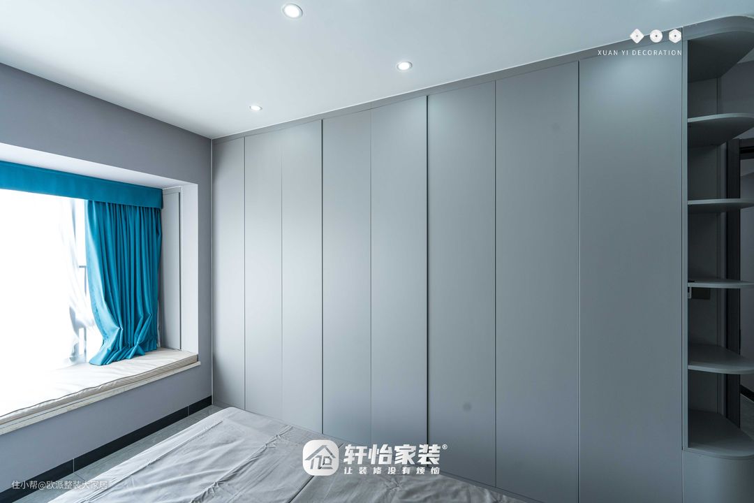 床卧和床头柜选择低调的雾霾蓝 不仅耐看,而且和窗帘的颜色很搭飘窗上面铺上垫子,放上抱枕偶尔坐着看书发呆也是极佳的放松去处 床尾的装饰画和床头的相呼应侧面是分段设计的到顶衣柜上面放被子,下面收纳衣物转角依然是贴心的弧形设计 美观且安全