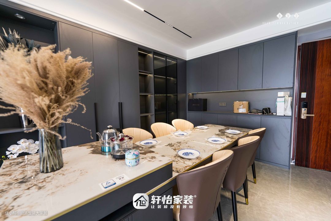 玄关柜和餐边柜呈L型连接满墙的高级灰搭配米黄色花纹岩板餐桌演绎着沉稳大气的现代感 餐边柜的一半选择用玻璃推拉门增加空间的通透另一边做长方形开放格放置银色大花瓶摆件和岛台上的芦苇干花遥相呼应 青花餐盘摆放整齐,颇有雅韵
