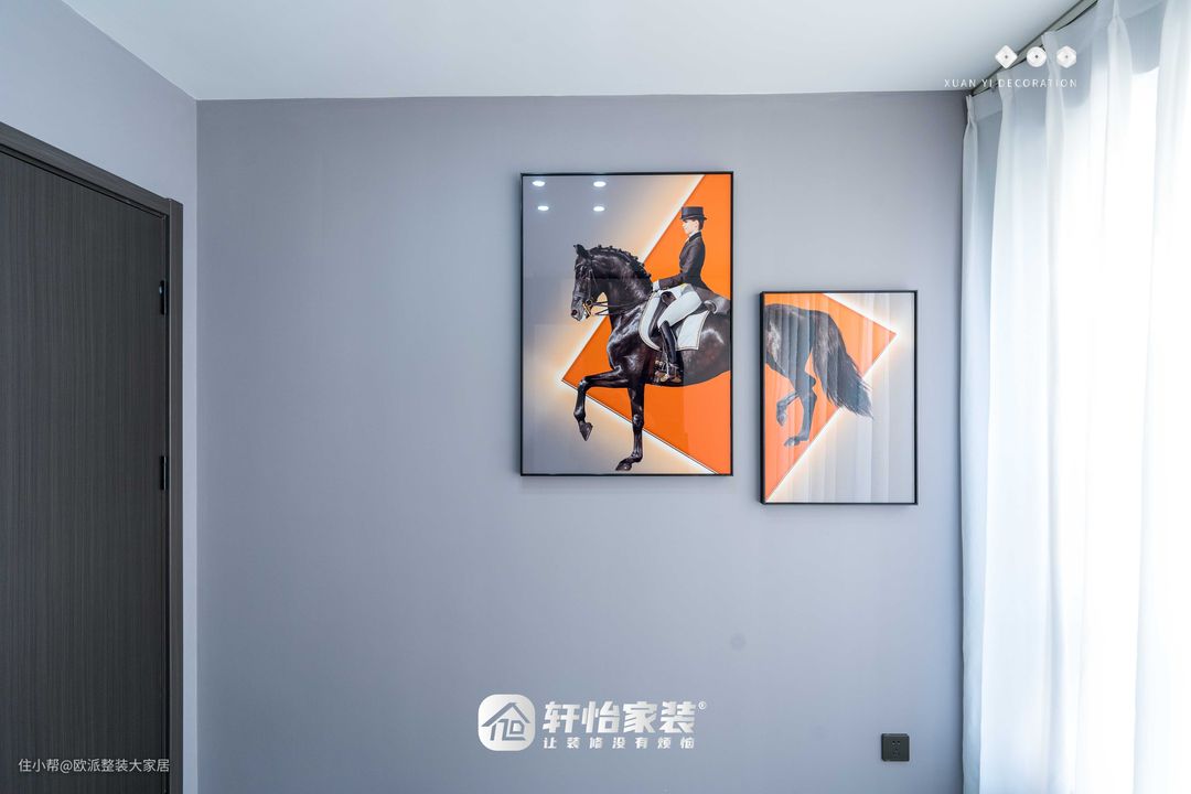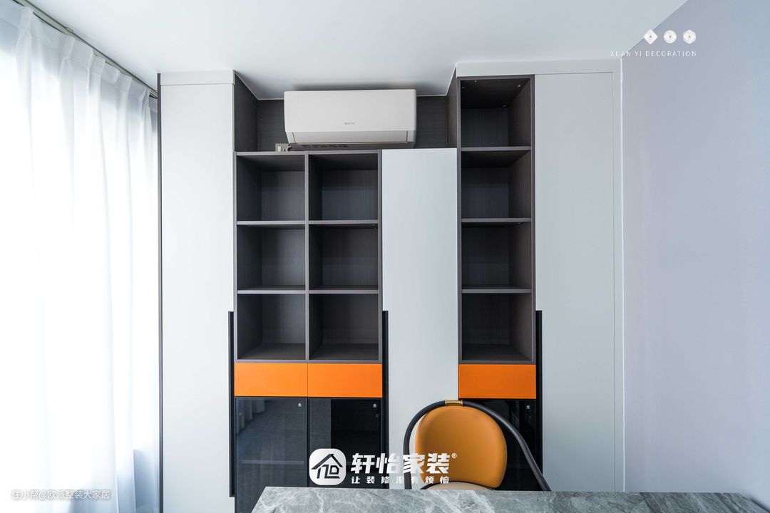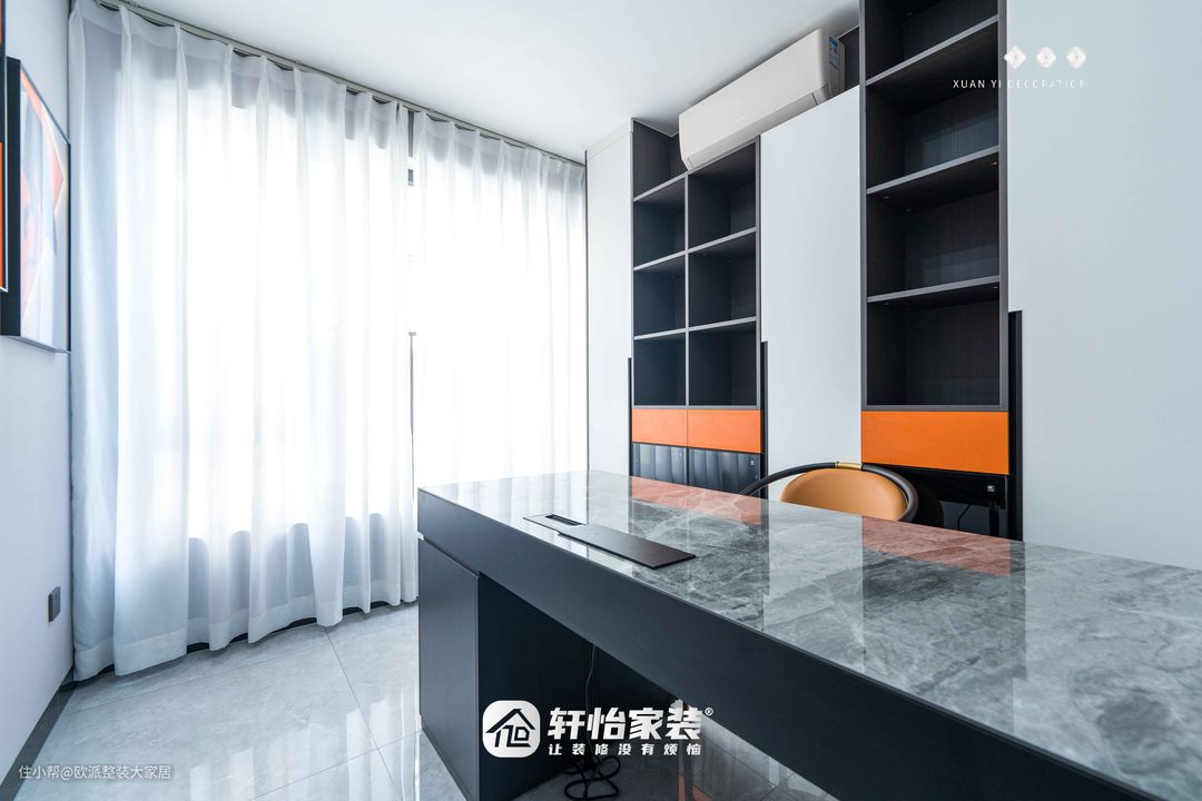 灰白的空间中一抹橘色打破了沉寂灰色花纹大理石面书桌流淌着光泽感 一大一小的装饰画画面和谐统一自然光透过白色窗纱加上灯光的照射两幅画闪闪发光,似有动感! 用简洁干练的空间设计去表达生活方式让生活回归简单质朴感受幸福治愈的时光