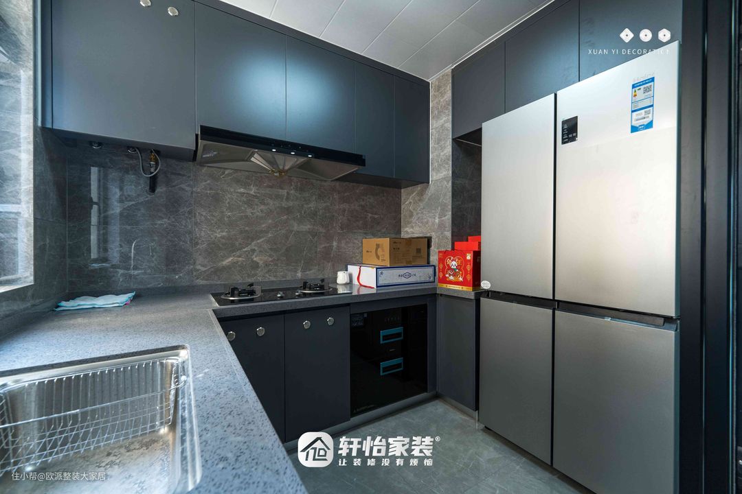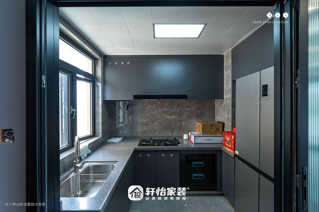厨房和餐厅用玻璃推拉门做隔断内部呈U型布局自然光和灯照双重照明让整个空间十分亮堂