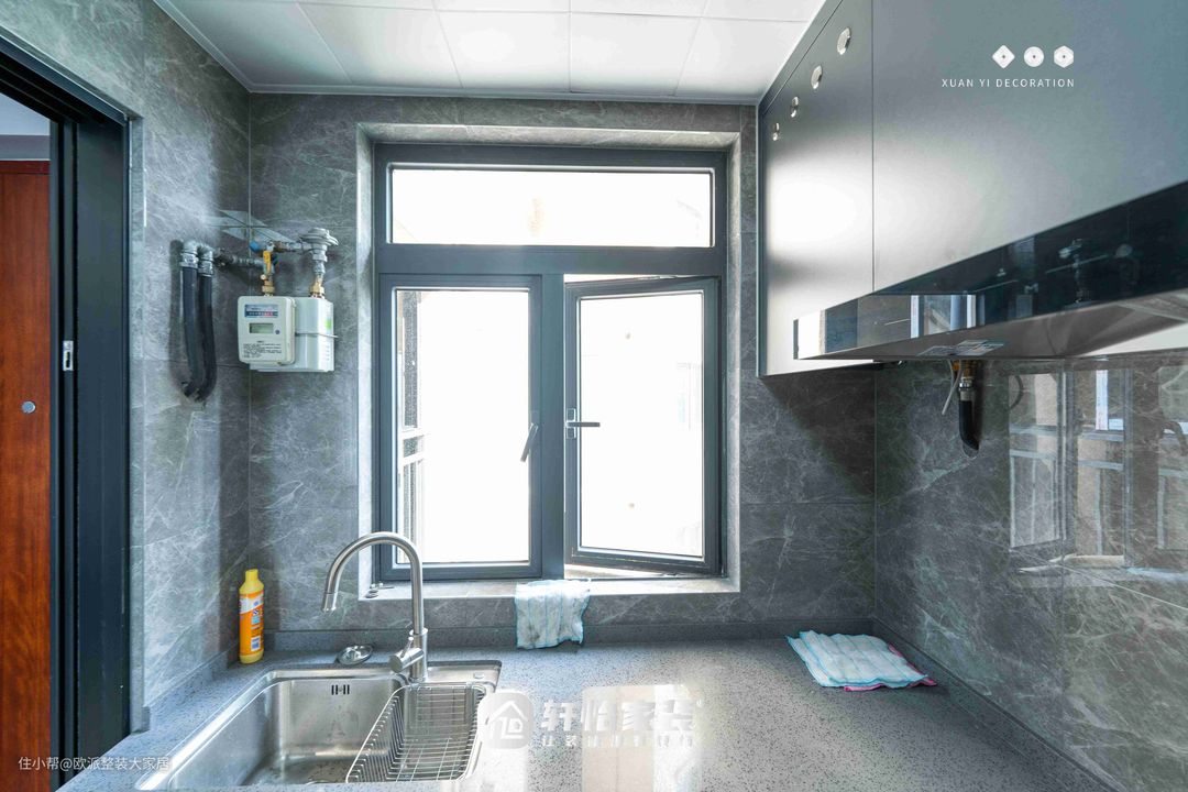 整体是灰色调 窗帘的吸睛蓝 让空间充满活力 墙面流畅的线条装饰画 带着几分科技感 到顶衣柜整洁简约 转角处做弧形开放格 减少进门的磕碰 悬浮式吊顶镶嵌灯带 空间立体感更强 墙面铺满灰色花纹亮面砖 搭配带有纹理的深黑色浴室柜 空间充斥着高级质感 阳光透过窗户洒下斑驳 干净舒适的浴室环境