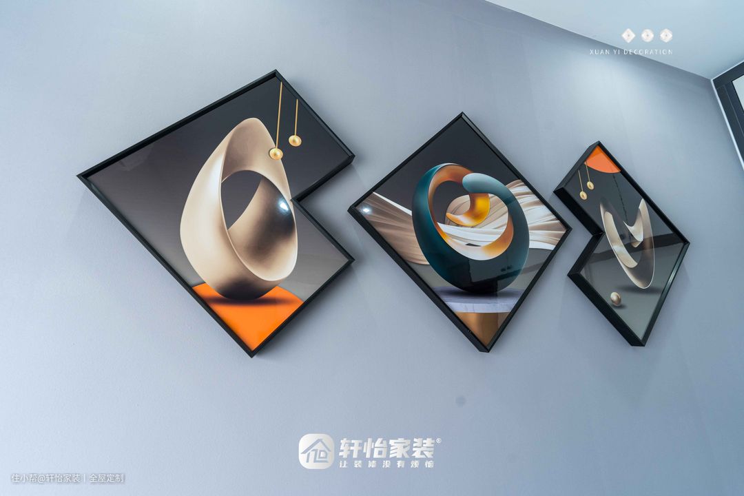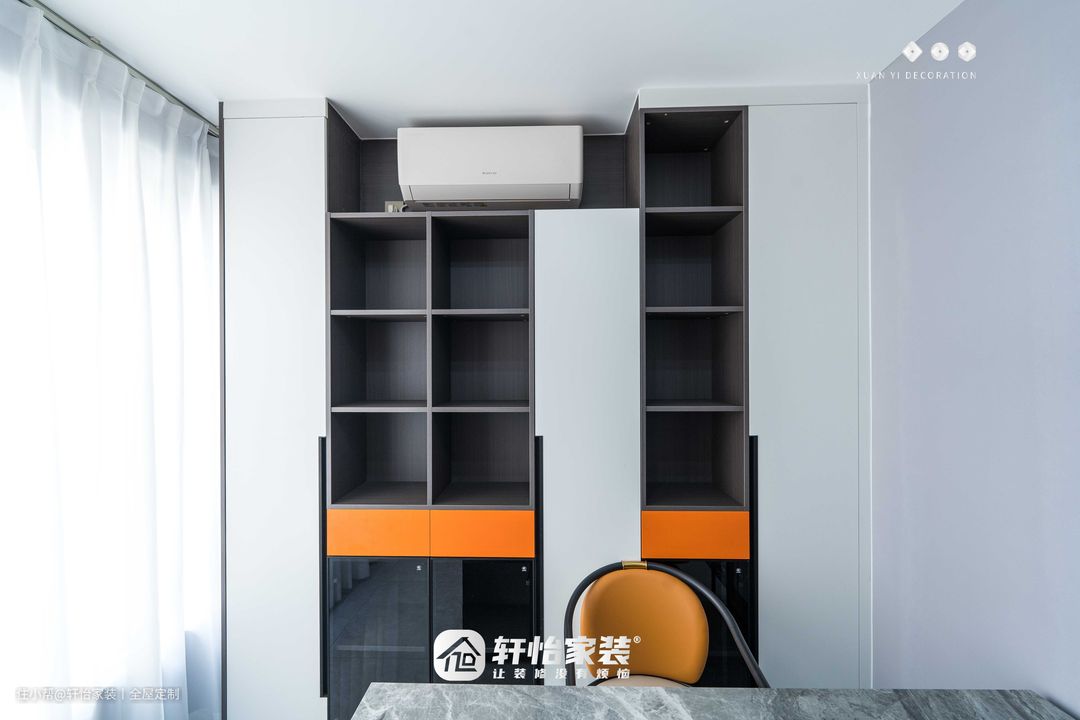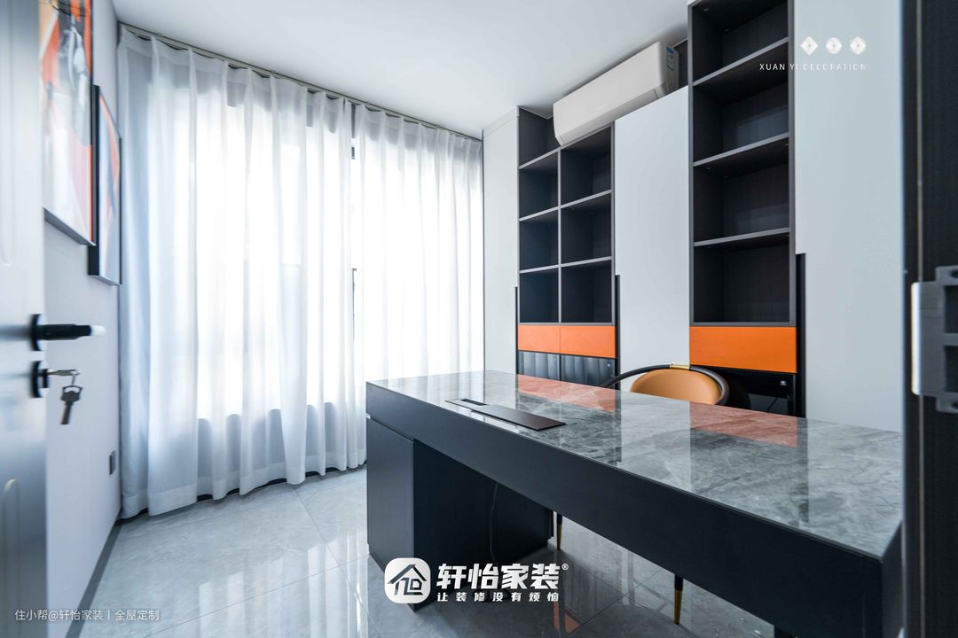 灰白的空间中一抹橘色打破了沉寂灰色花纹大理石面书桌流淌着光泽感 一大一小的装饰画画面和谐统一自然光透过白色窗纱加上灯光的照射两幅画闪闪发光,似有动感! 用简洁干练的空间设计去表达生活方式让生活回归简单质朴感受幸福治愈的时光