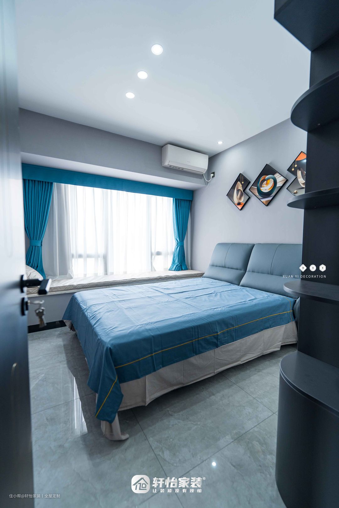 床卧和床头柜选择低调的雾霾蓝 不仅耐看,而且和窗帘的颜色很搭飘窗上面铺上垫子,放上抱枕偶尔坐着看书发呆也是极佳的放松去处 床尾的装饰画和床头的相呼应侧面是分段设计的到顶衣柜上面放被子,下面收纳衣物转角依然是贴心的弧形设计 美观且安全