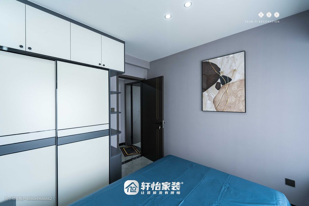 床卧和床头柜选择低调的雾霾蓝 不仅耐看,而且和窗帘的颜色很搭飘窗上面铺上垫子,放上抱枕偶尔坐着看书发呆也是极佳的放松去处 床尾的装饰画和床头的相呼应侧面是分段设计的到顶衣柜上面放被子,下面收纳衣物转角依然是贴心的弧形设计 美观且安全