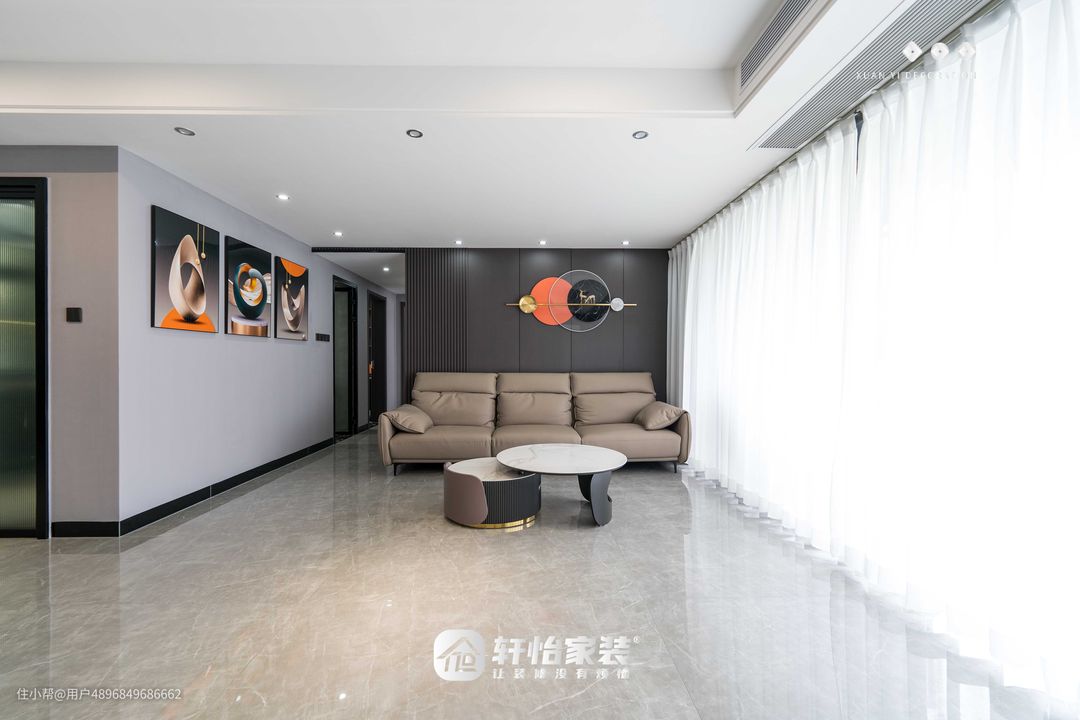 现代风装修 选用简洁明亮的配色 搭配没有过多装饰的家具 恰到好处的精致 给人带来清爽宽敞的感觉 本期案例是120㎡的新房装修,选用时下流行的高级灰色调,简约清爽,运用筒灯、灯带、磁吸轨道等多种发光源,提升居家氛围感。 设计思路: 1、玄关柜和餐边柜一体化设计,动线流畅,进门通透感十足; 2、全屋以黑白灰为主色调,用橘色和蓝色做点缀,高级且耐看; 3、卧室衣柜侧面均做弧形设计,充分考虑居家中的安全因素,居住舒心放心。