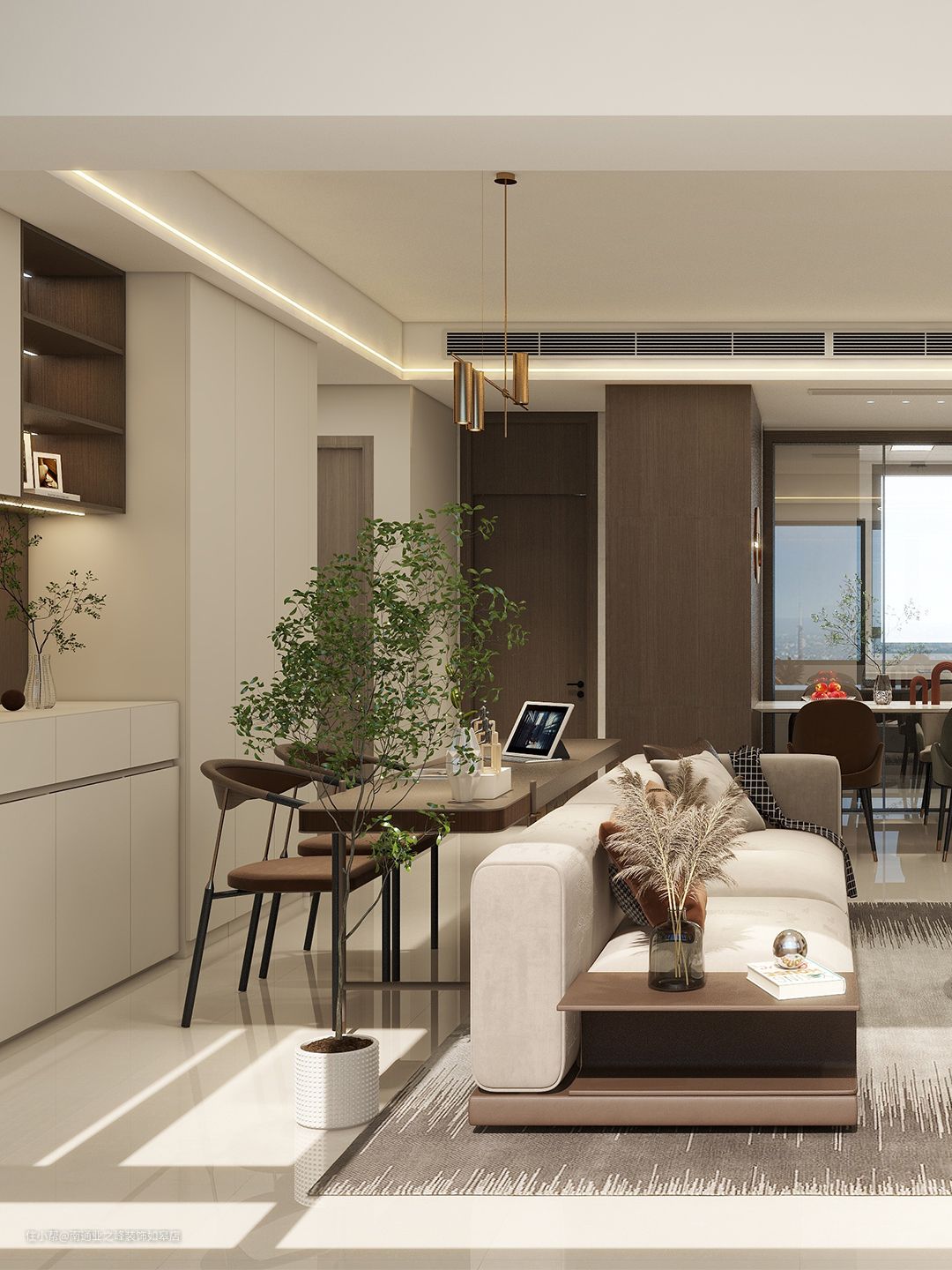 客厅是一间屋子的灵魂,那么书房就是生活的启蒙。 打破常规的客厅布局,将书桌搬到客厅的一体化设计。