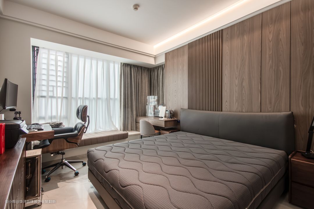 主卧背景墙同样采用木饰面墙板,延续温润质朴的自然质感,木格栅赋予灵动的层次感与韵律美,木质暖调营造一个沉稳静谧的睡眠空间。吊顶在靠近床头的位置留有缝隙,内嵌的灯带点亮床头区域,也营造出更温馨的氛围。 由飘窗延伸出梳妆台,充分利用角落的空间给女业主一个专属空间。 一门到顶的白色衣柜搭配黑色超长拉手,处处细节都能感受到简约风格所彰显的精致生活态度,实用而不失时尚。