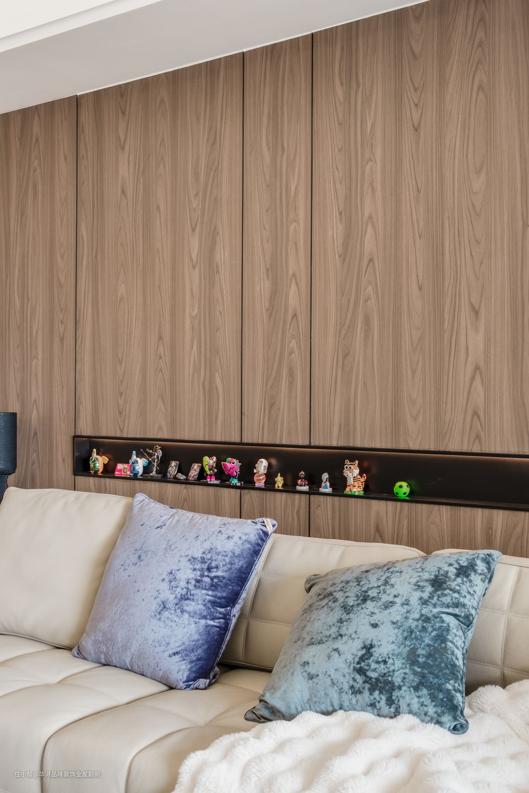 客厅采用现下流行的无主灯设计,双眼皮悬浮吊顶搭配灯带空间感十足,在视觉上有拉高层高的效果。 因为业主不喜欢白色的墙壁,便以木饰面墙板与岩板共同沙发背景墙,两种材质不同的纹理碰撞出强烈的视觉效果,质朴与粗犷融合出富有质感的空间。 满墙电视柜将现代简约的时尚与实用表现得淋漓尽致,简洁的线条勾画出高级感满满的空间,内部拥有大量收纳空间,将隐形收纳进行到底。黑色开放格的加入提供了展示的空间,地柜与电视柜中间镂空,利用格栅板饰面,都让电视背景墙有更丰富的层次感。