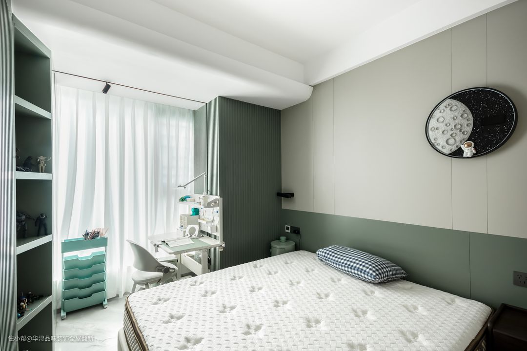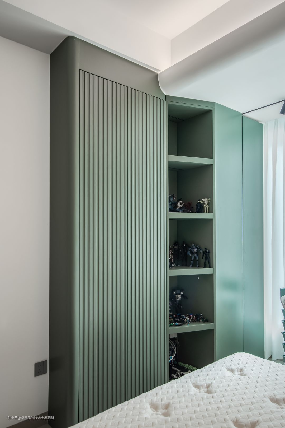 女孩房以粉白两色为主色调,唯美浪漫的色彩搭配给小公主一个梦幻的空间。利用墙体在书桌上方设计了内嵌式书柜,给孩子一个安静、实用的学习空间。 男孩房以绿白两色为主色调,房间洋溢着清新自然的气息。打掉飘窗拓宽卧室空间,在靠窗位置设置书桌,让学习区域的光线更加充足。 在拐角处加入开放格,正是设计师充分了解房屋结构后的巧妙设计,既是作为两侧衣柜的连接和过渡,也给孩子一个展示心爱之物的空间。