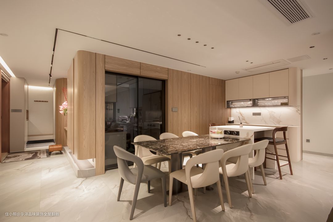造型简约大方的岛台餐桌与整体风格和谐统一,岩板桌面提升空间质感,岛台既可以处理食材或制作轻食简餐,还可以作为吧台使用,成为一个聊天、品酒的小天地,让餐厅凝聚更多温暖与情感。