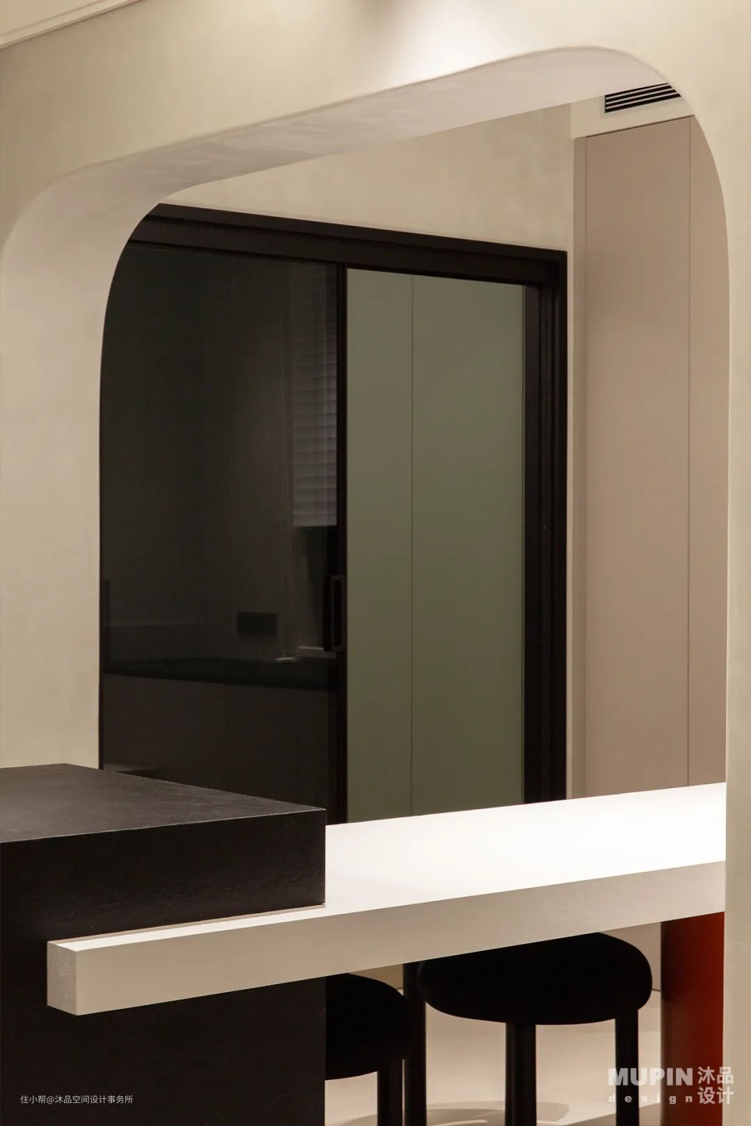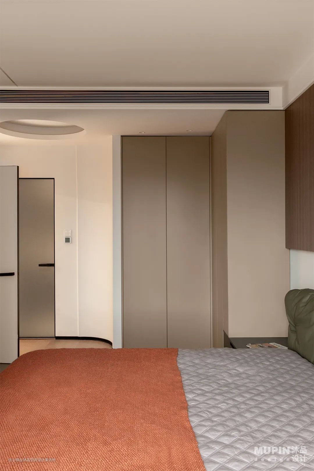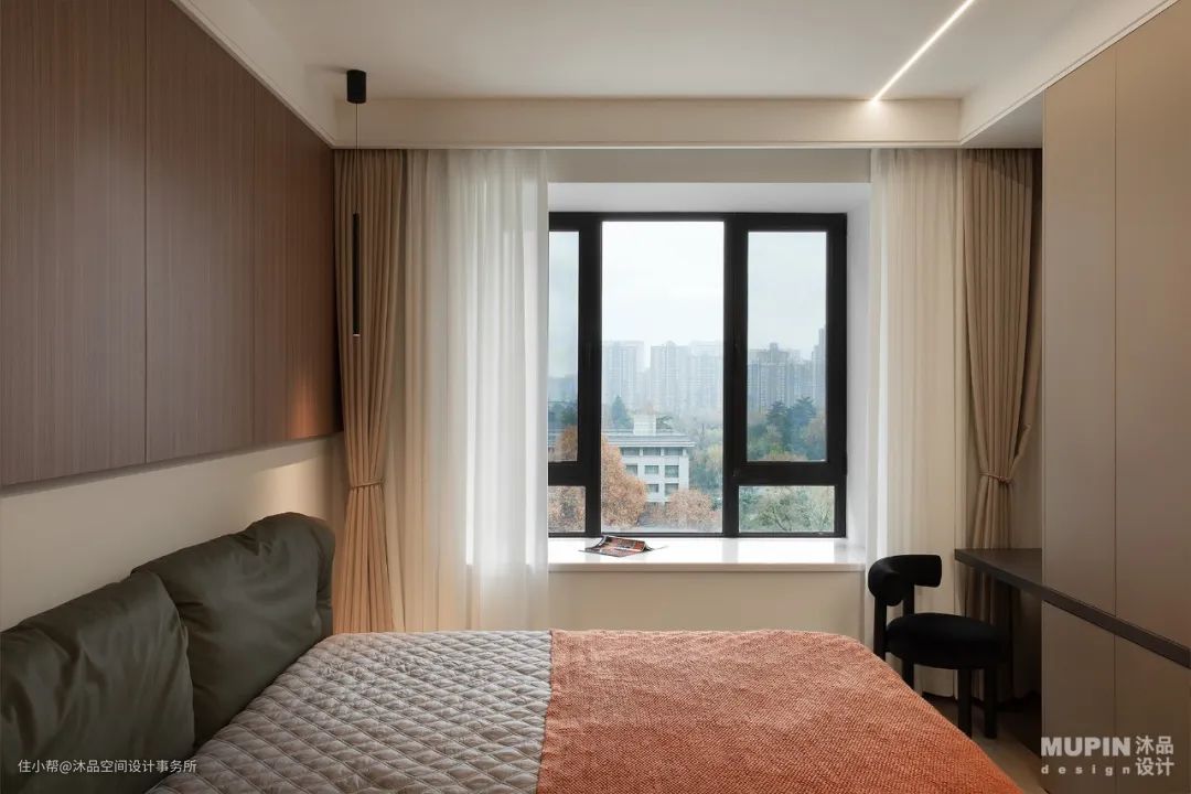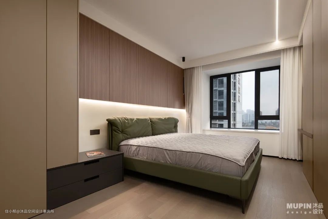 立面与顶面弧形错落的设计, 演绎动与静、 功能与艺术的平衡美。 时光在卧室内慢慢的变得悠扬了起来, 没有车水马龙,没有灯红酒绿, 只有属于此处的一方静地。 淡雅的色彩和开阔的布局, 都让卧室的节奏变得更加的缓慢了起来, 寻一处空地,慢慢的坐下,同内心和生活对话。