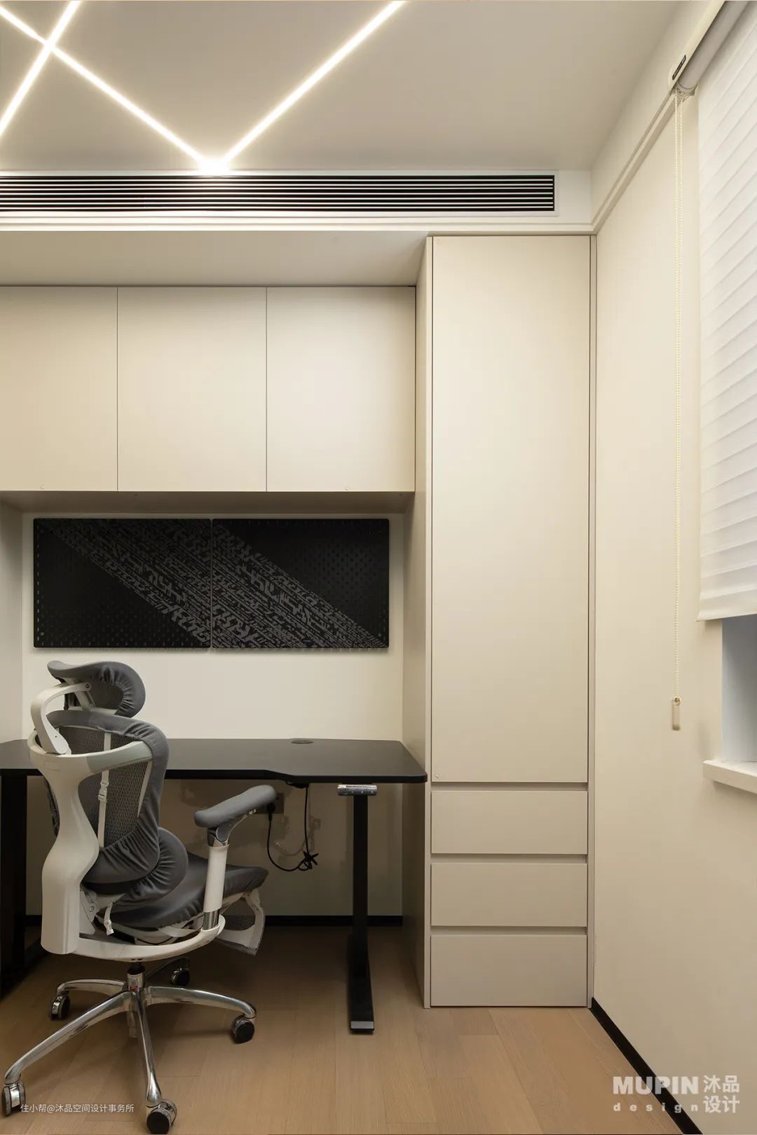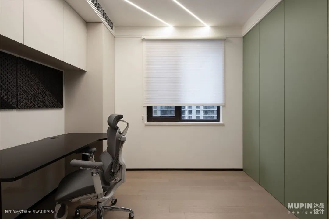 书房内低饱和基调自带高级感, 一抹绿色在空间中晕染开来简约和舒适。 沉静的绿色营造出安静的工作学习氛围。 在这个空间里的每个人都能找到自己的热爱, 不管是工作学习还是休闲娱乐都是如此。 设计无须过于繁多,点到即可。