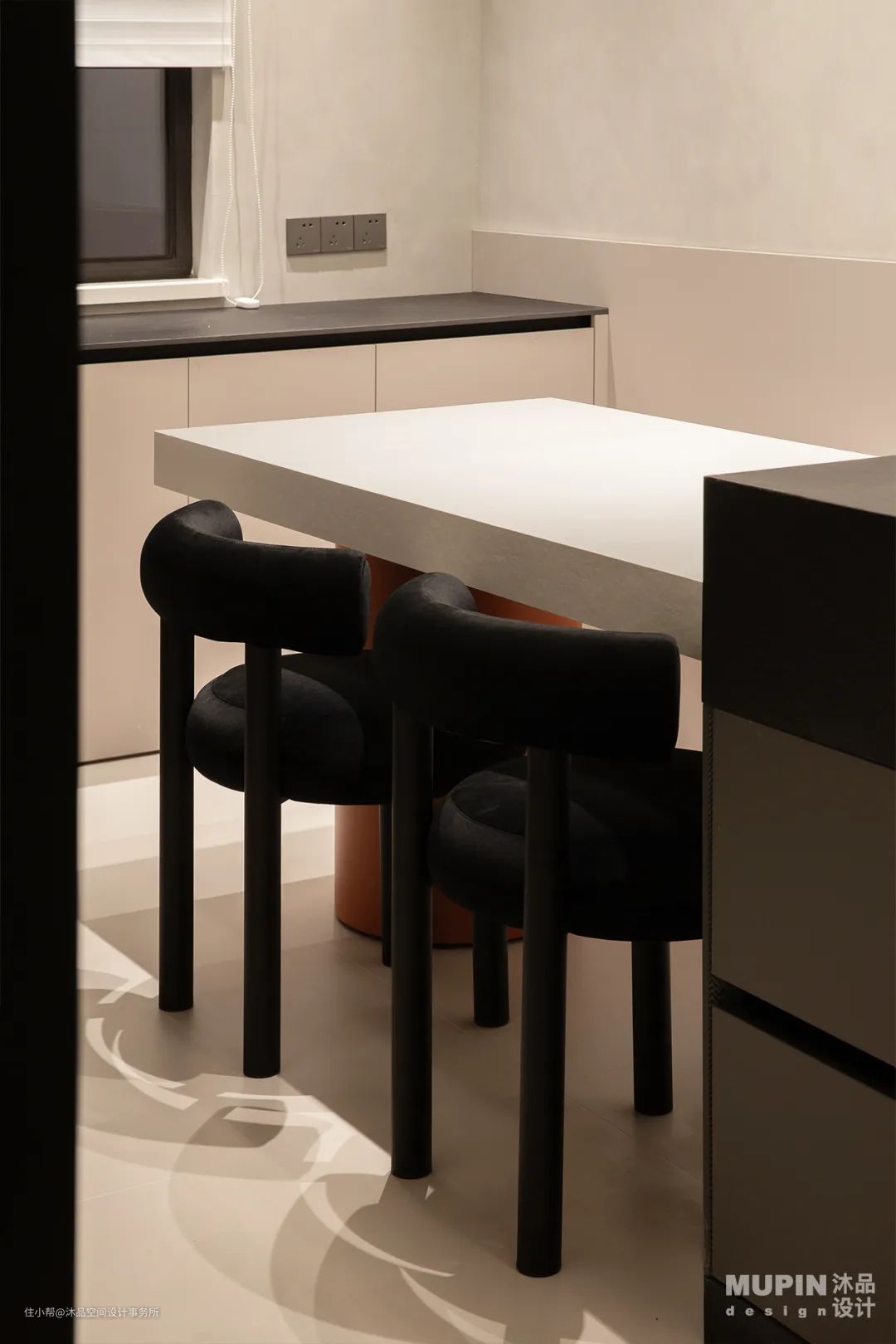 客餐厅一体的设计, 减少了空间的封闭感, 流畅的动线延伸了整体的视觉感, 增加了家人的互动性与交流性。 餐桌连接岛台, 满足了使用的同时, 又增加一些附属功能。
