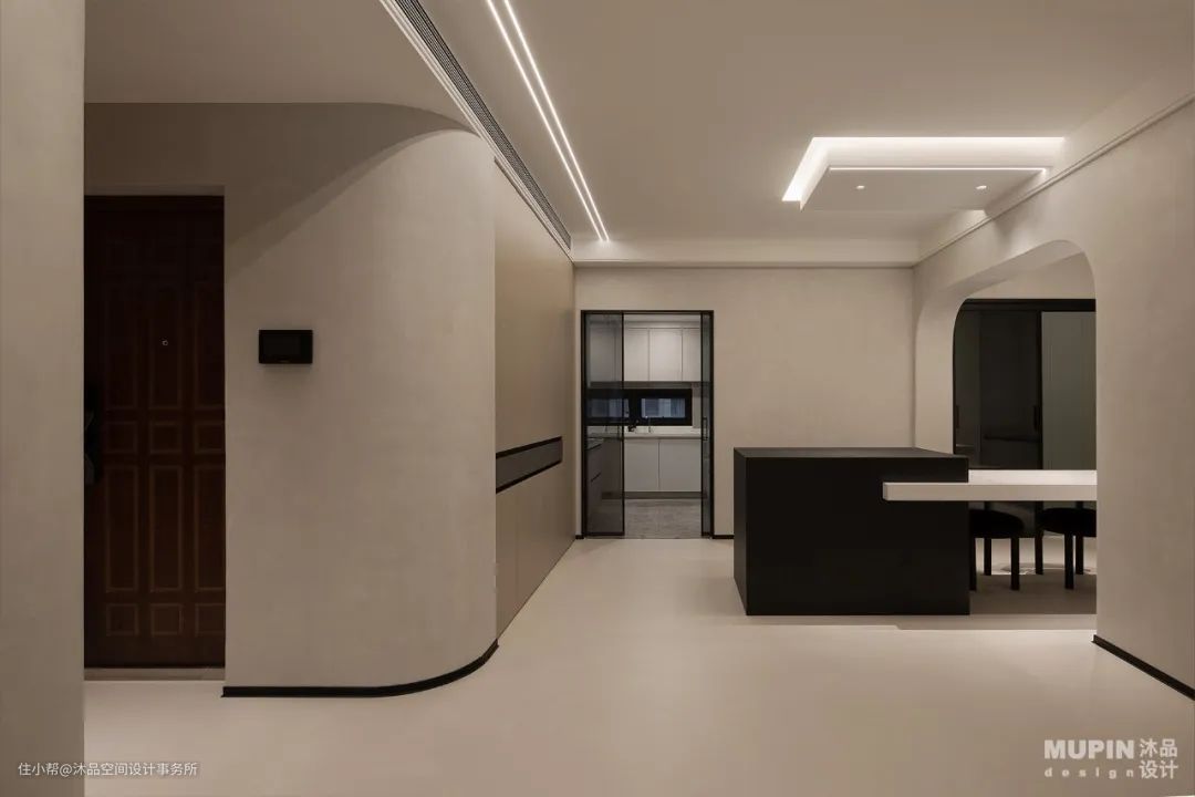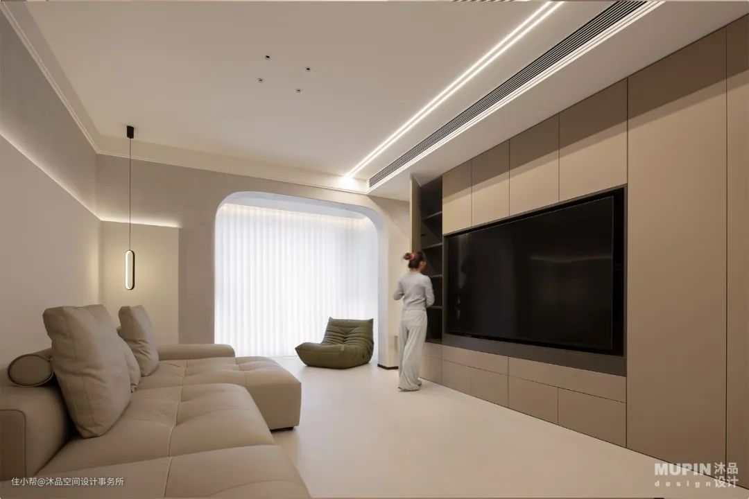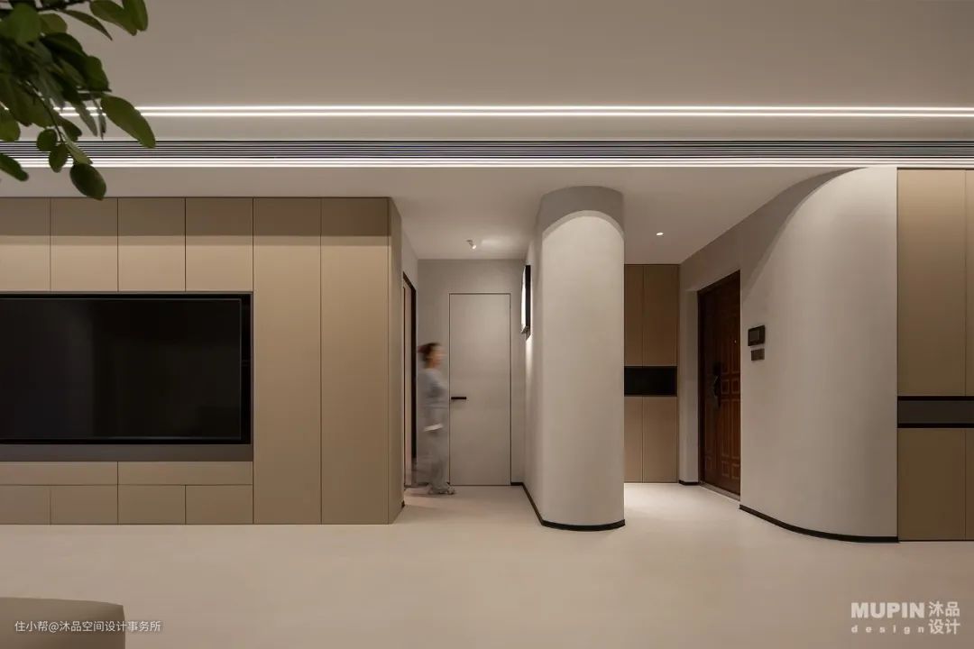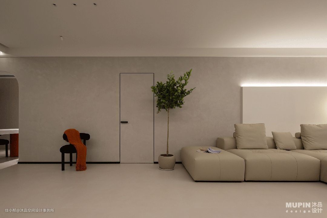步入客厅内,淡雅色调的客厅呈现男主人期待的极简设计, 亮色的家具成为点睛之笔。 柔软的家具材质与温润亲和、防霉耐擦的艺术漆墙面, 为屋主营造了安全放松的空间。 肌理漆的原始质感, 为空间奠定一种内敛而丰腴的艺术基调, 以完整的场景感和材质的肌理美, 令空间由内而外释放着直透人心的纯粹力量。 功能至上,是住宅空间的核心。 使用者的习惯通过设计得到穿插与延伸变化, 空间线条凝练爽利,块面简洁有序, 让视觉变得轻盈通透, 隐形门将空间的功能性与审美性结合得恰到好处。 注重多重构建的和谐, 墙面亦做弧形处理与之呼应, 营造空间造型的自然之感。 客厅以无主灯设计为主, 射灯作为空间主光源。 沙发、茶几、绿植也都是精心挑选, 简洁且不失设计感。