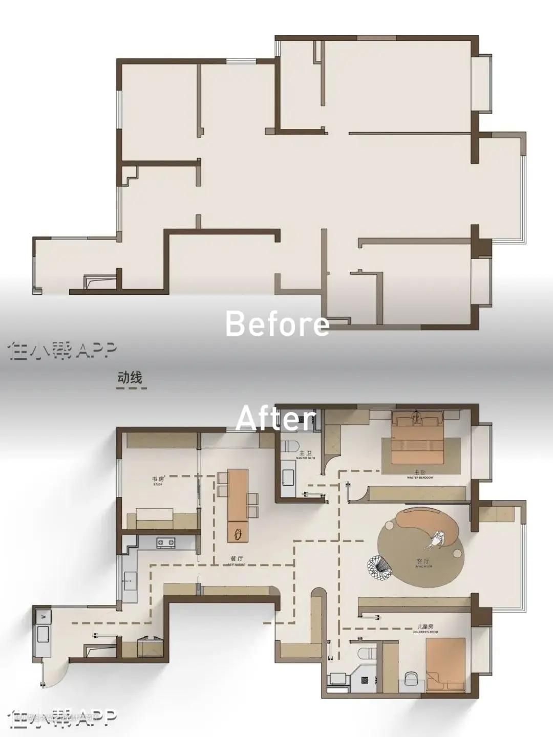 ①每个区域都比较方正,是精装房比较合理的装修标准。 ②各个空间功能相对独立封闭,不够开阔亮敞。 ③原本的餐厅面积小,空间无法合理利用,采光较弱且动线不合理。