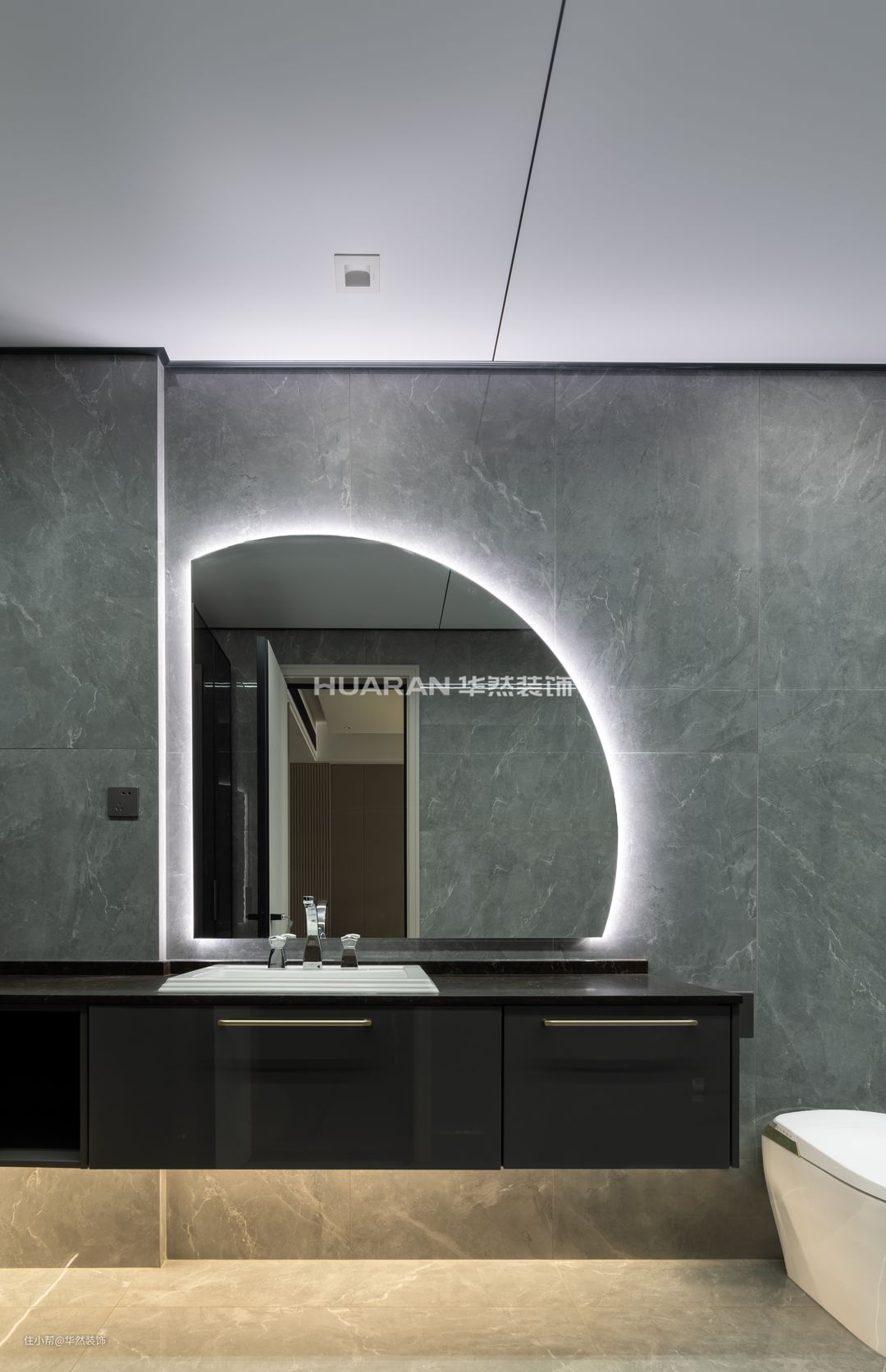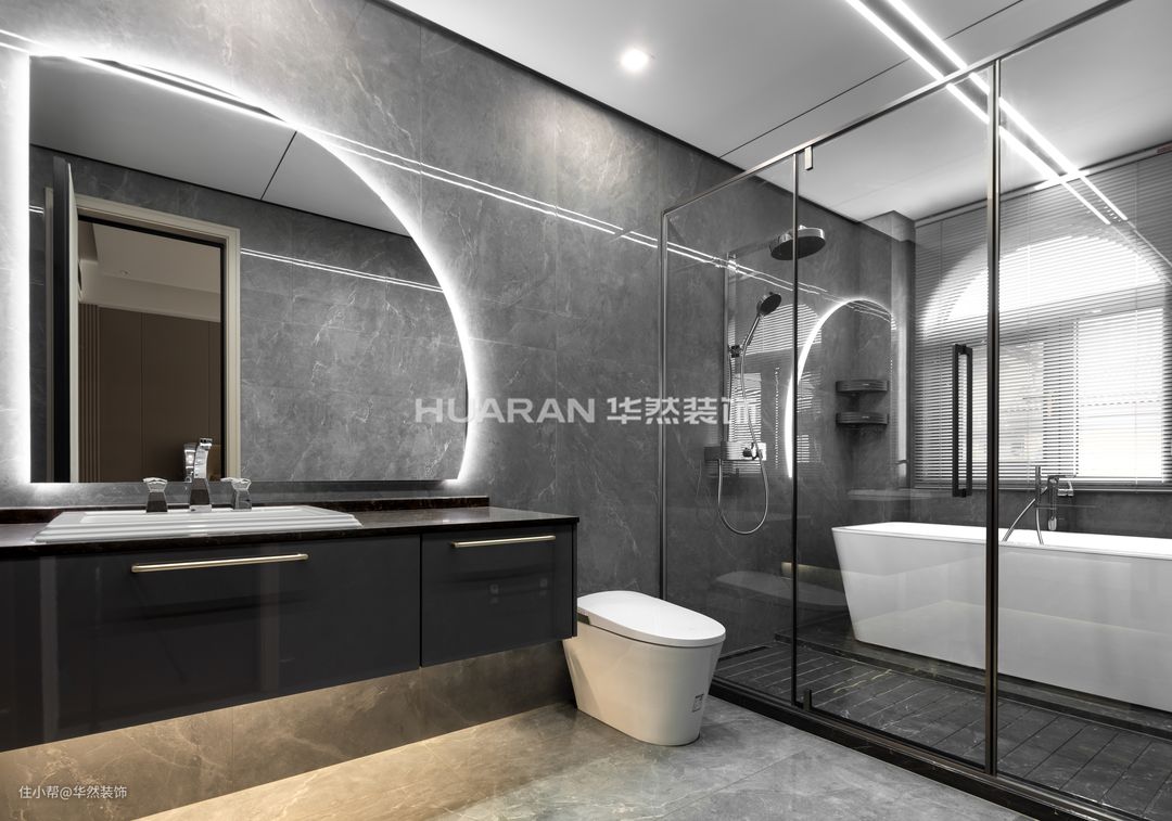卫生间干湿分离 悬浮浴室柜 在有限的空间里将视觉感官达到最大化 洁白的浴缸 弧形的智能镜 让浴室在简净清爽中焕发高级意蕴