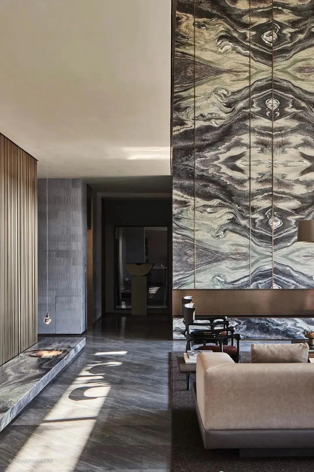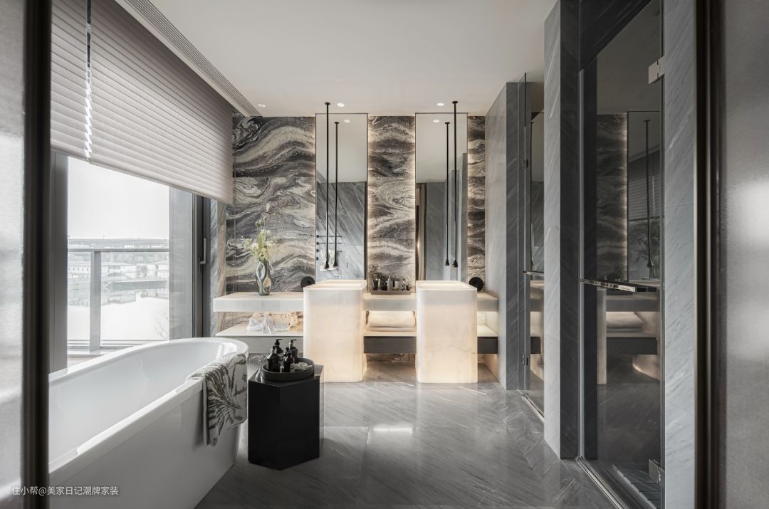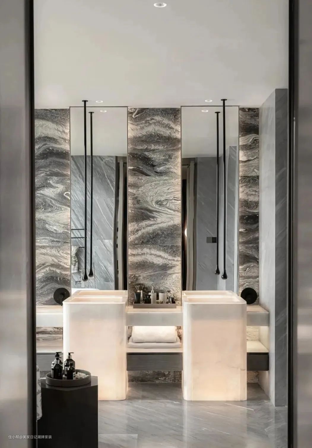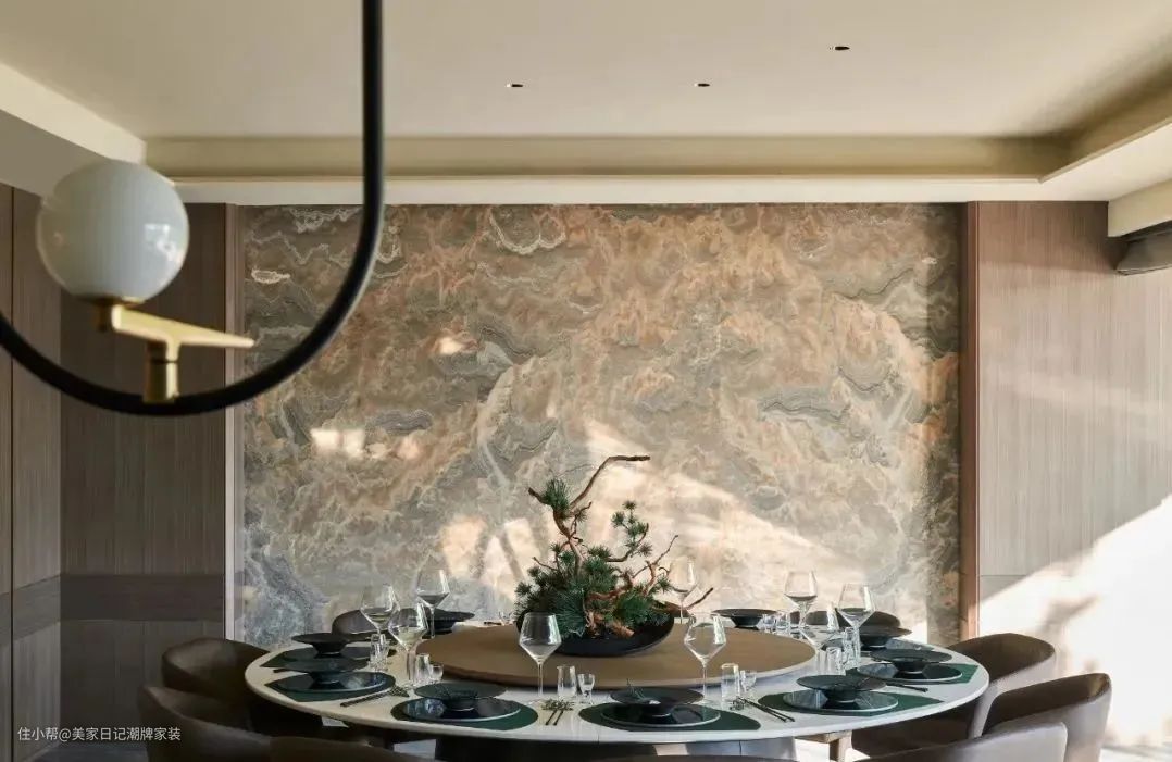 餐厅凝聚东方精神,水墨纹理的大理石背景墙奠定了整体基调,圆形餐桌有团圆之意。