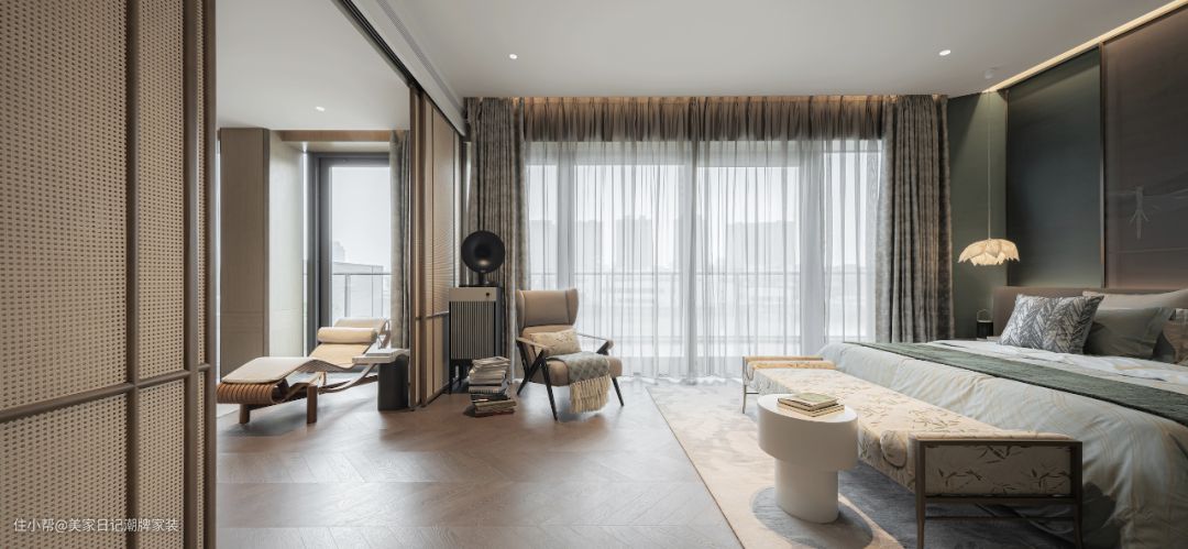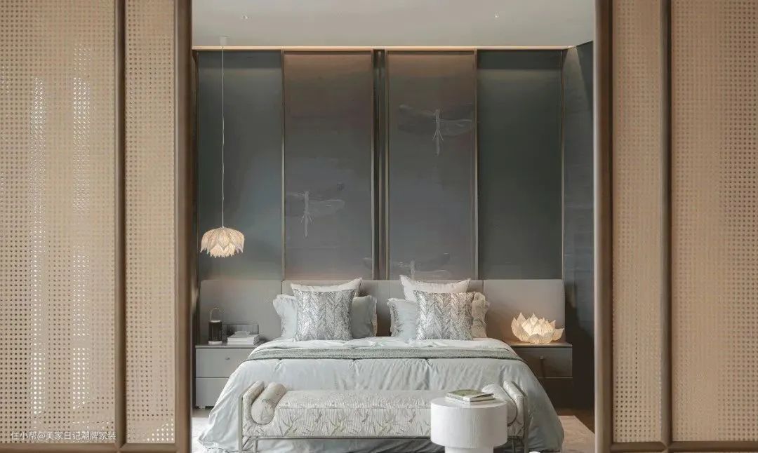 卧室的宽敞足以满足一天的需求,轻薄的窗纱带来轻盈与慵懒感,以翠鸟为灵感的地毯,刺绣屏风、蜻蜓元素的贯穿让卧室有轻描淡写的艺术美,也有自在轻松的心境。