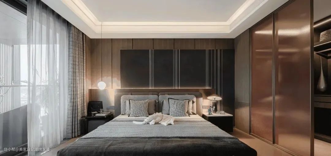 次卧整体更加稳重,暖色调的极简更具有文化深度,光线的嵌入削弱沉闷。
