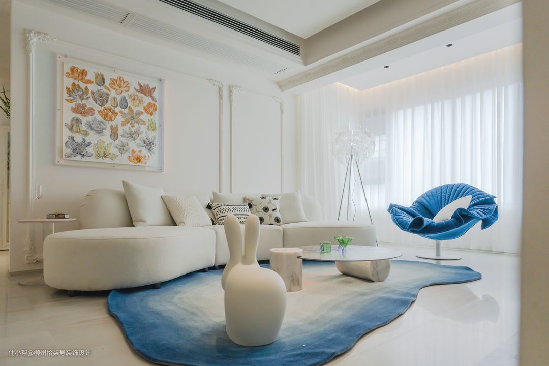餐椅以亚克力花瓣椅做为白色空间的点亮花瓣椅与客厅的挂画相呼应、色彩鲜亮