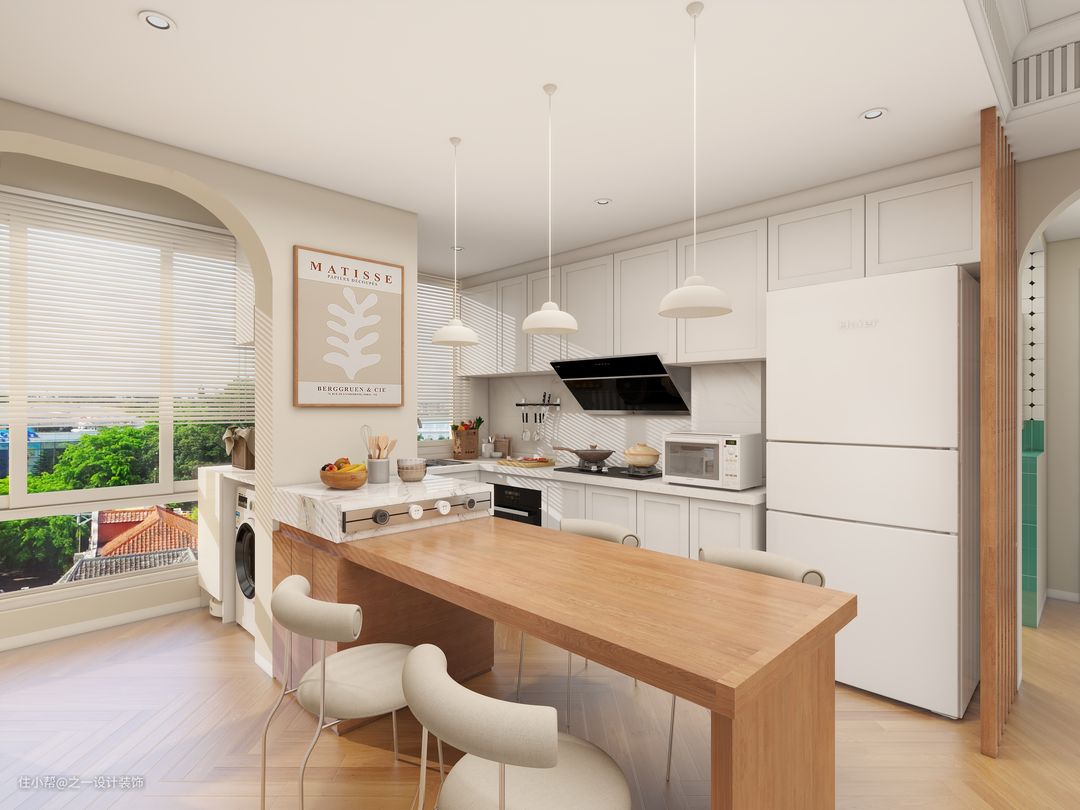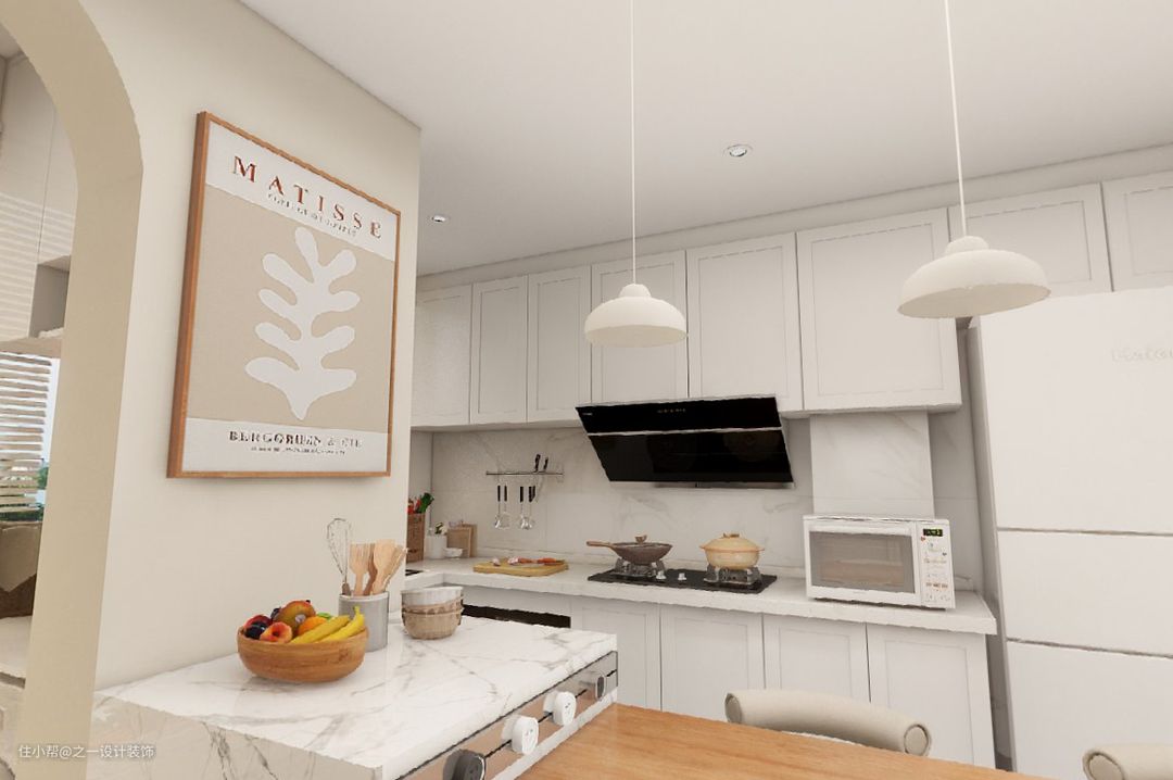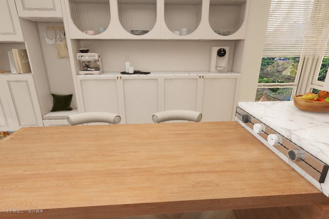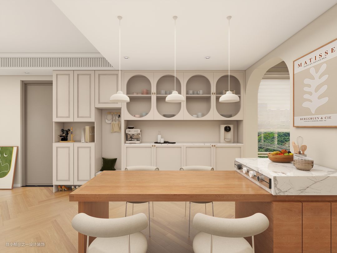 餐厅采用轻奢岩板岛台餐桌一体的餐桌,餐桌可收缩,不用时可以收起来,增大空间利用率