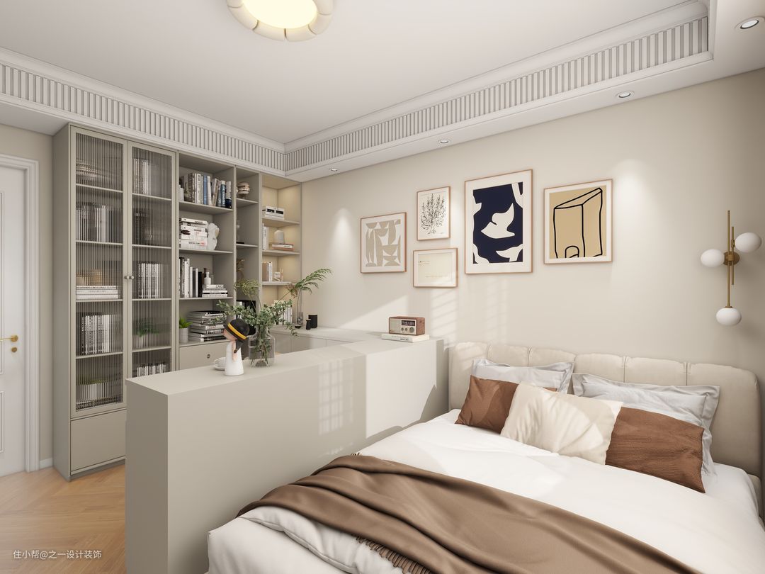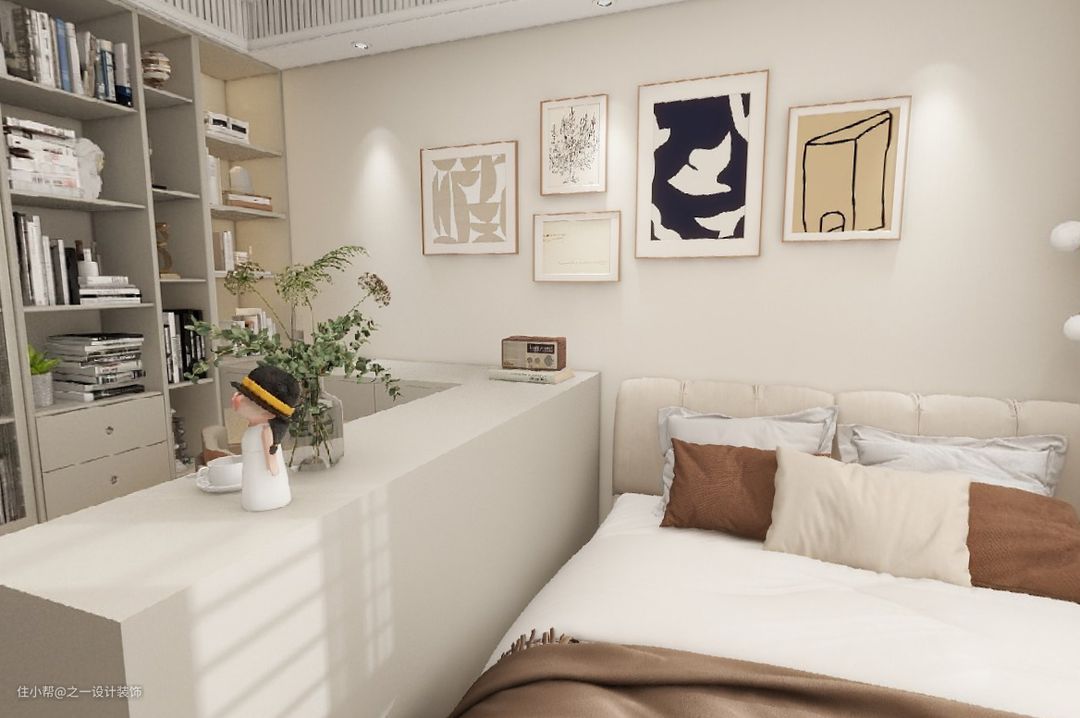 主卧用收纳柜分割出书房与床的区域,能更好的工作与生活