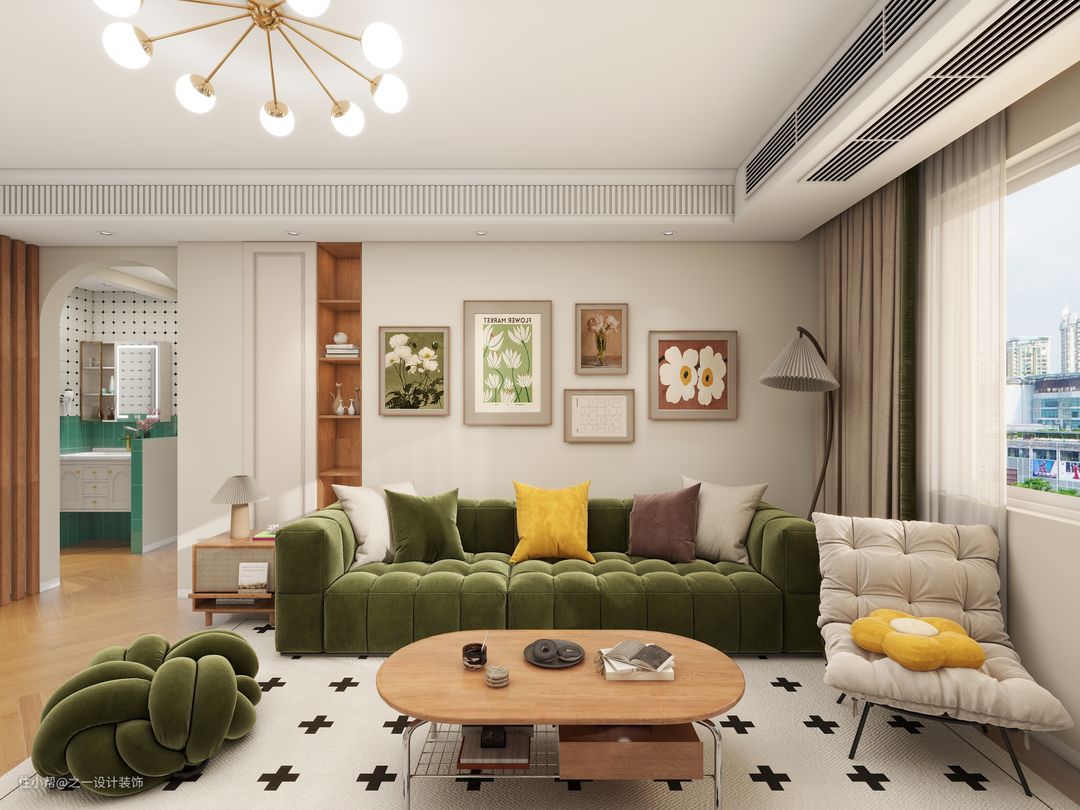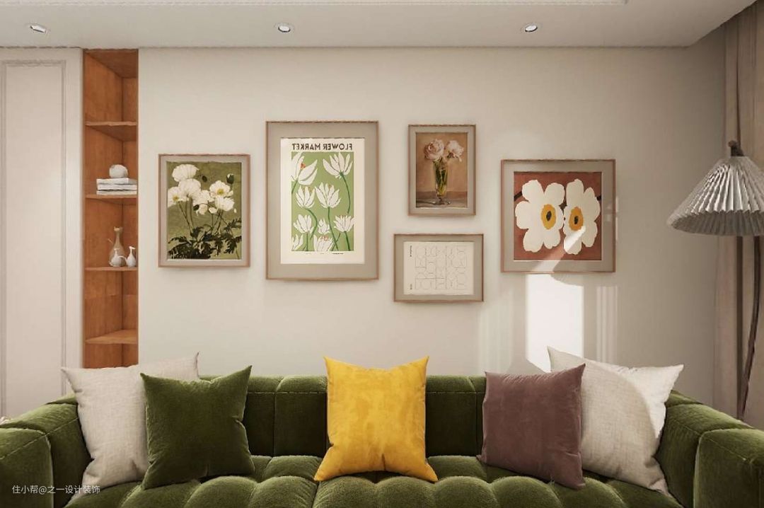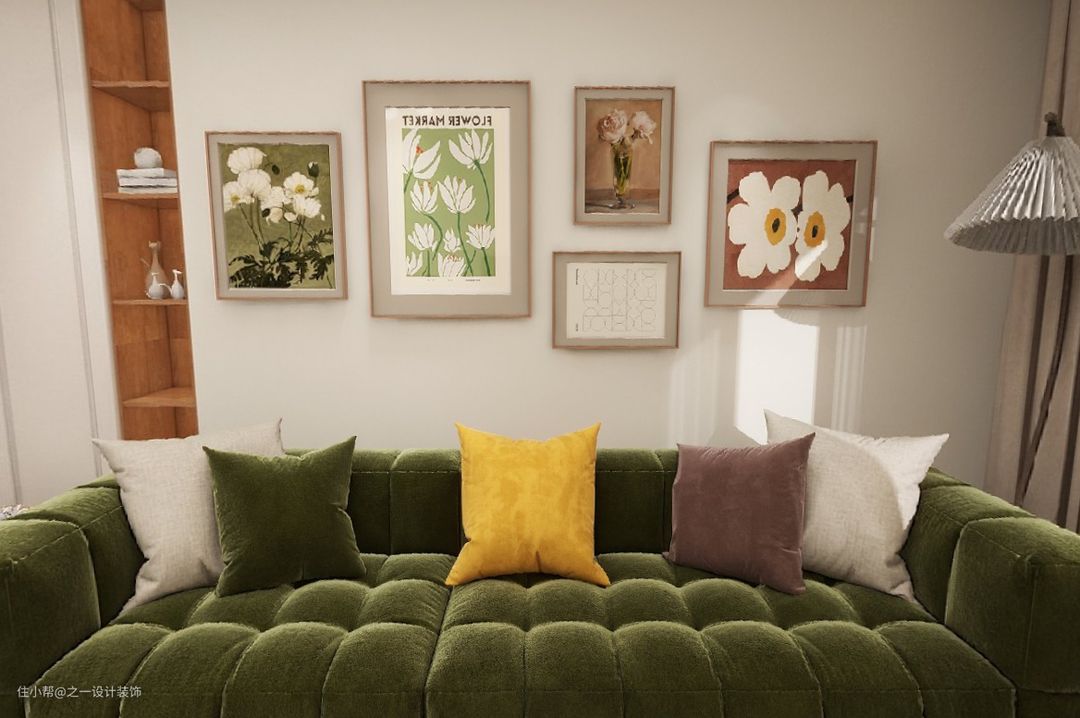 复古棉花糖云朵绒布直排的沙发,搭配轻便的木质茶几,在满足使用需求同时,不至于拥堵,墙上搭配装饰挂画,别有一种复古格调。