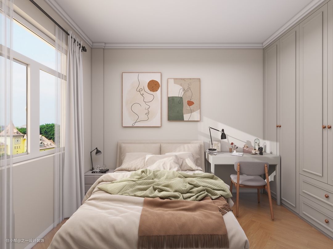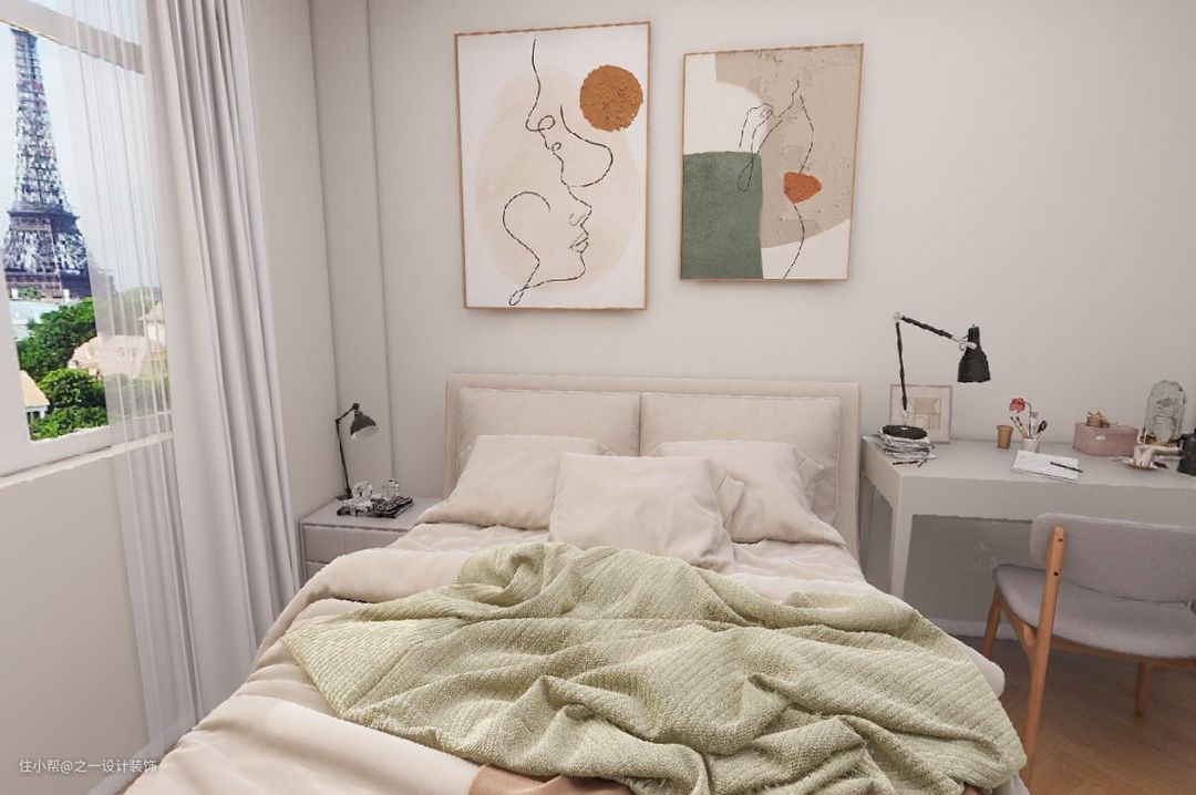 次卧的挂画与吊灯一左一右保持空间平衡感