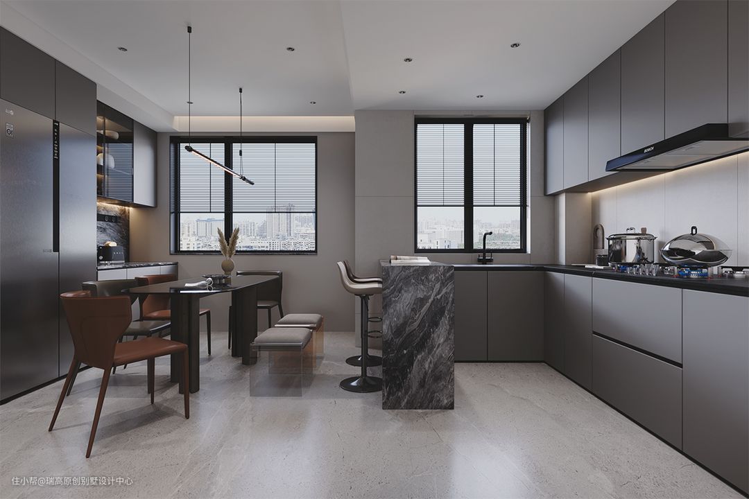 厨房与餐厅融为一体,吧台设计提升了生活品味。同时,厨房的开放式设计和切角处理,既美观又不影响使用,真是太实用了!