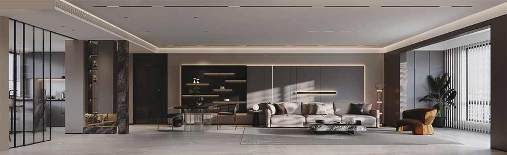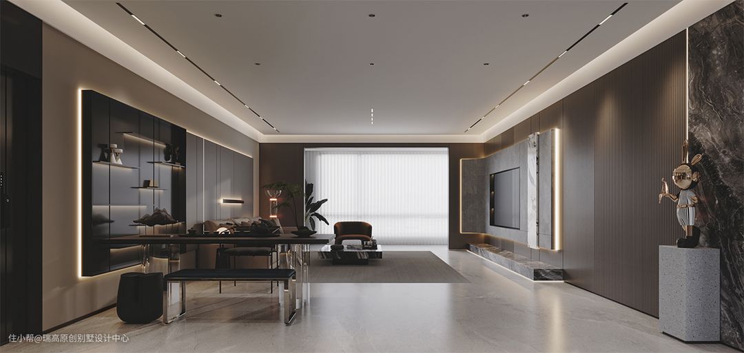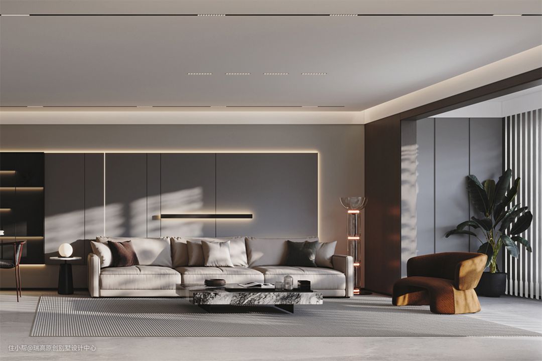 在客厅,入户处的玄关造型墙设计,不仅增加了私密性,还成为了一处亮丽的风景。电视背景墙的弧形处理,别具一格,凸显出独特的个性。