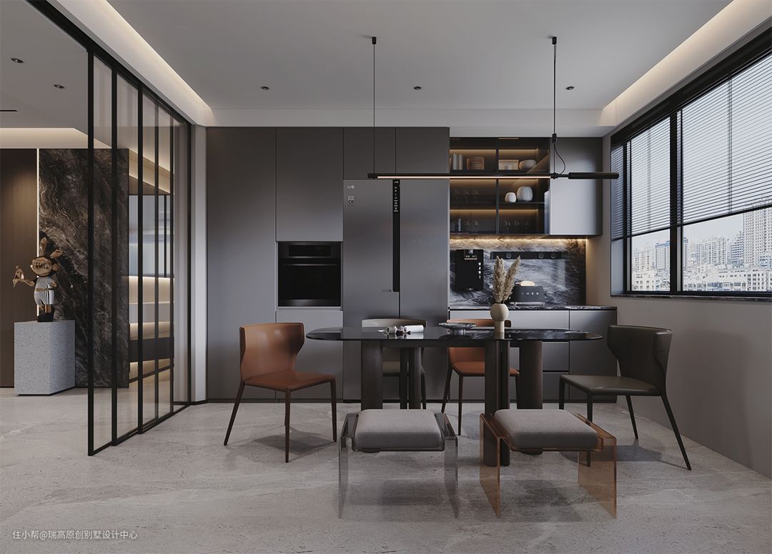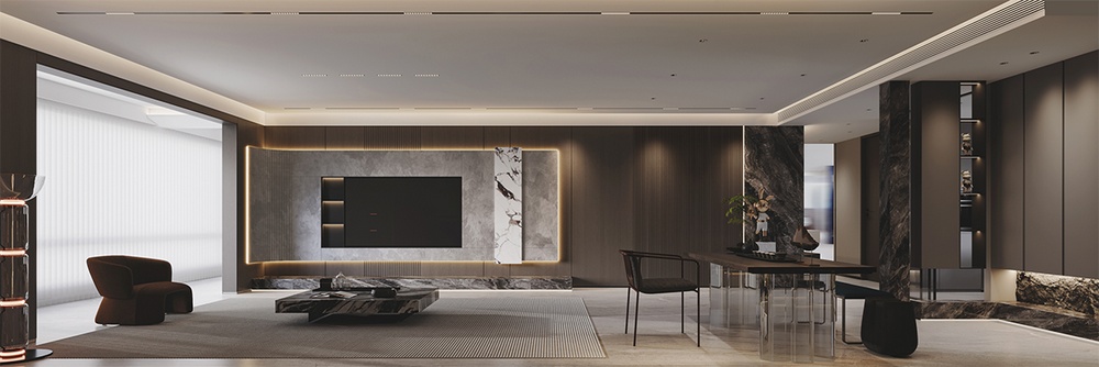 整个空间被打通,客餐厅一体,显得通透又宽敞。深木色家具的大量使用,让空间视觉效果倍增,艺术气息扑面而来。无主灯设计使得整体空间更加明亮通透,线性灯、磁吸轨道灯的巧妙搭配,营造出层次感和氛围感,让人感受到舒适与温馨。