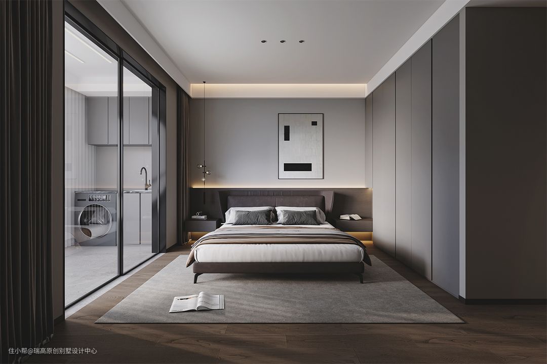 阳台连接着客厅与主卧,面积宽敞、采光充足。洗衣机和隐形晾衣架的设计既实用又美观,储物柜的增加也满足了收纳需求。梦幻窗帘的选用更是提升了整个空间的艺术氛围和美感。设计师巧妙地将卫生间进行压缩,挤出了一个衣柜的位置,解决了收纳问题又不影响卫生间的使用。真是太聪明了!