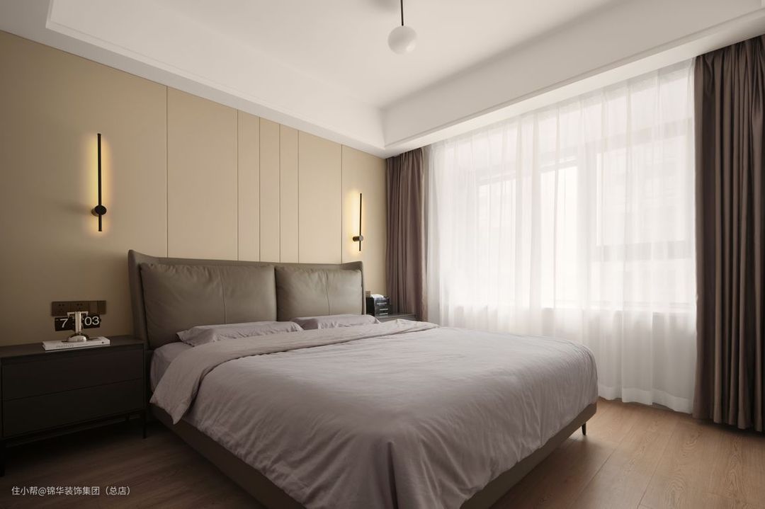 主卧背景墙以浅色硬包饰面为主。营造出宁静深邃之感,极简柔和床品色调展现复古慵懒格调,极简壁灯让空间不显单调。