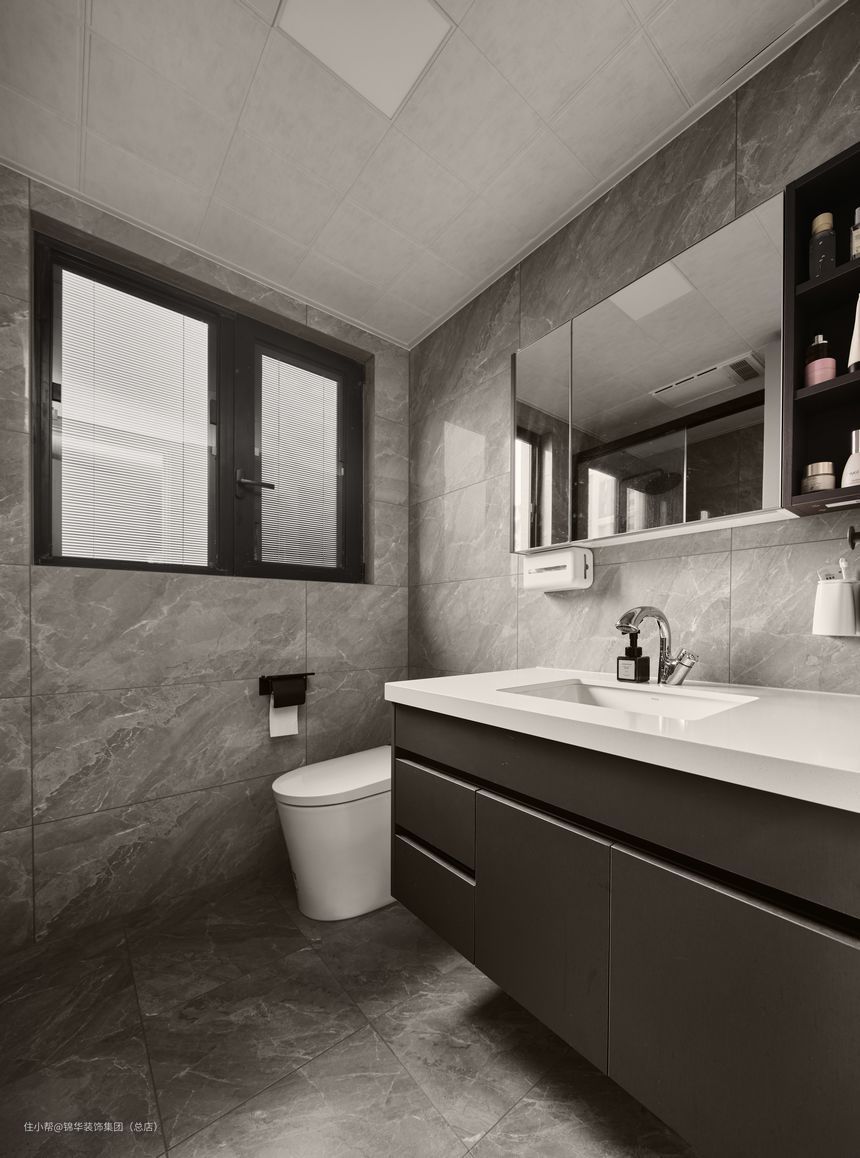 深色砖具有极强的视觉冲击力,卫生间选用了无边框镜子与白色洗手台,干净整洁且优雅,更显简约高级感。 项目风格:现代简约风 项目地址:南京-锦绣珑湾 项目面积:135㎡