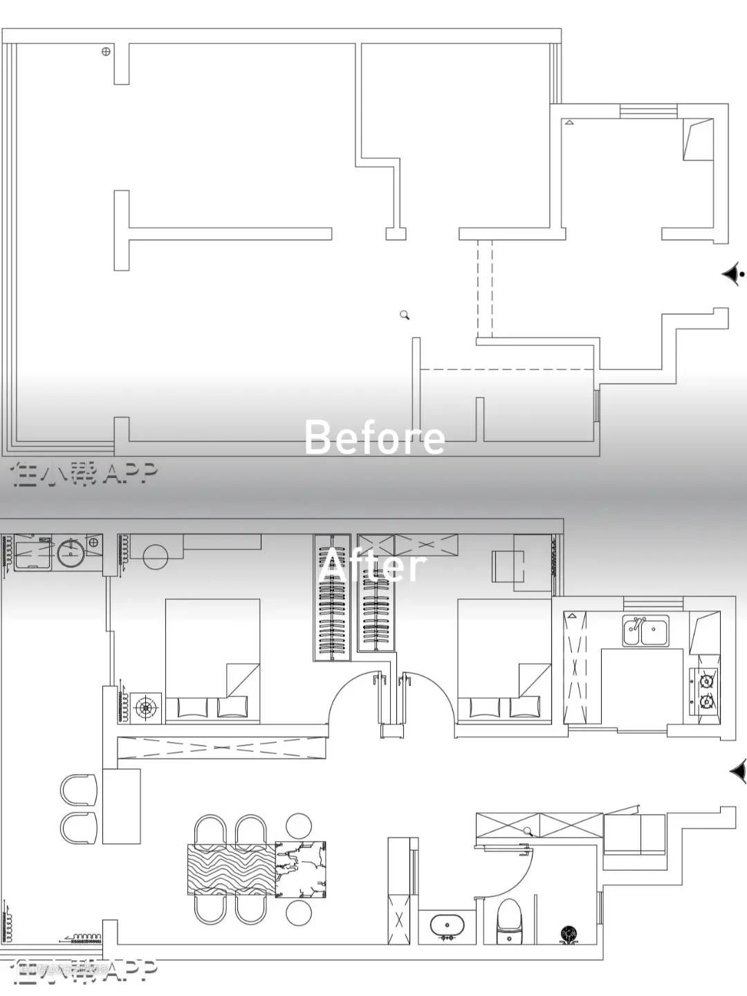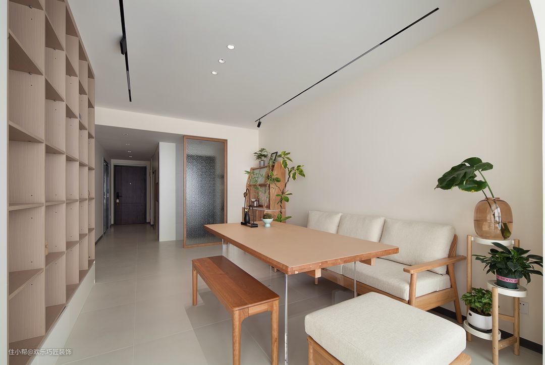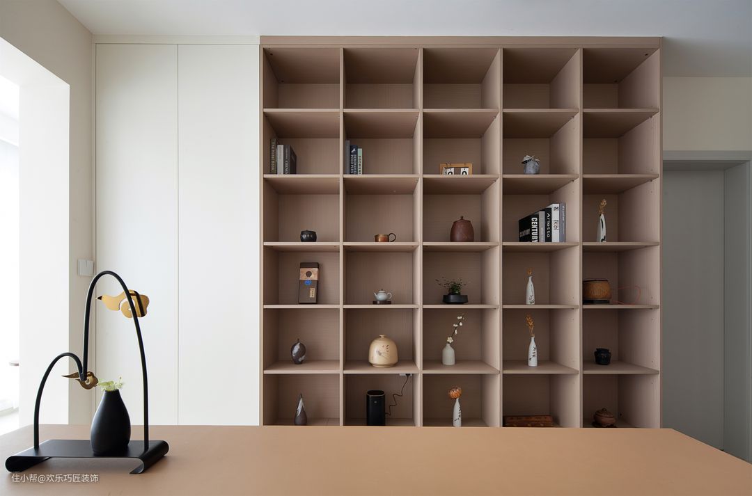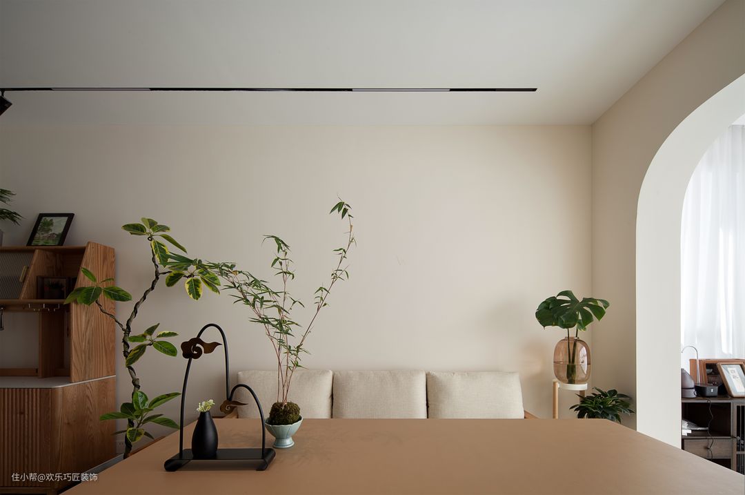 以实用性为出发点,汲取横亘于时间与空间的灵感,触达视觉表面和内心情感。素雅的沙发背景墙与咖色收纳柜背景墙相对矗立,在色彩和结构的维度,让畅想与写实的差异同时存在。利用不同的绿植装点,提升空间的生命力,以淡雅节制、深邃禅意为境界。